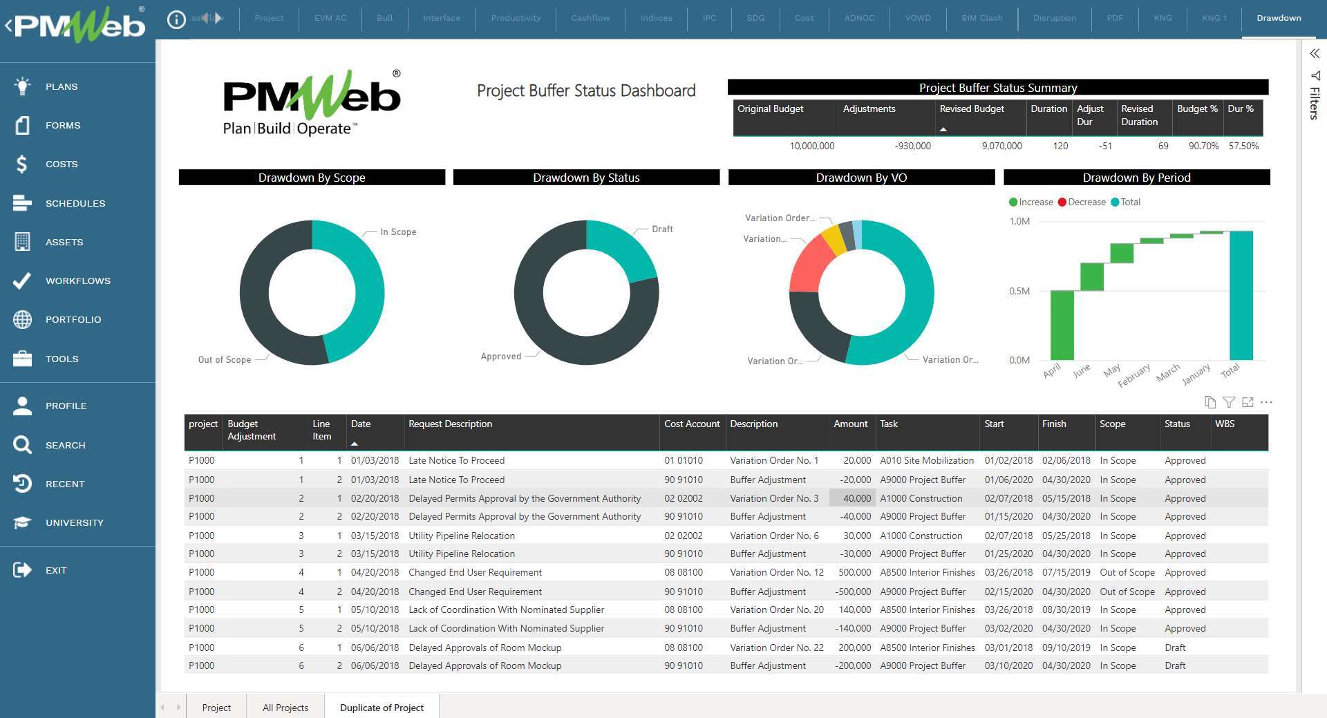 The Cost and Schedule Buffer Status dashboard provides real-time single version of the truth of a project buffer status. The dashboard includes a log of all budget adjustments that are related to buffer consumption, current cost and schedule buffer consumed and available for each project stage.