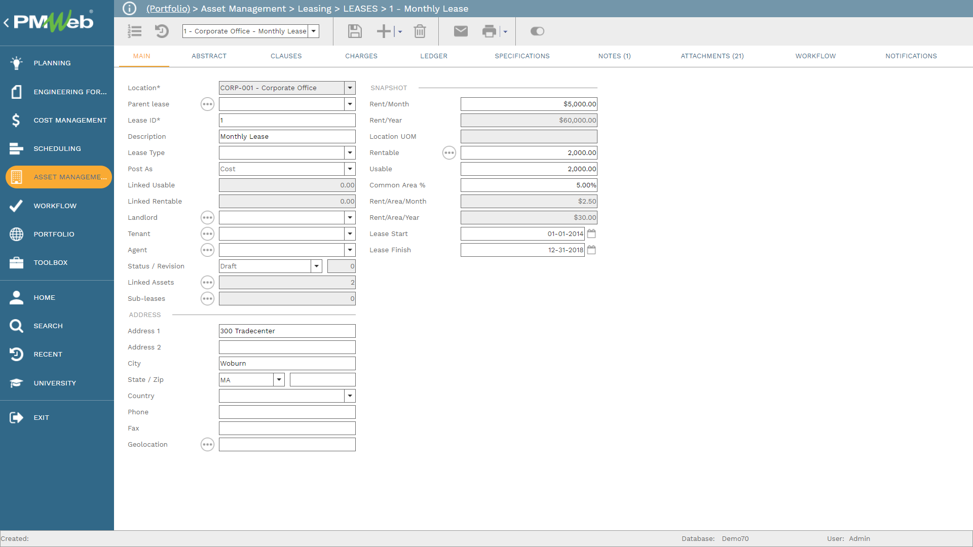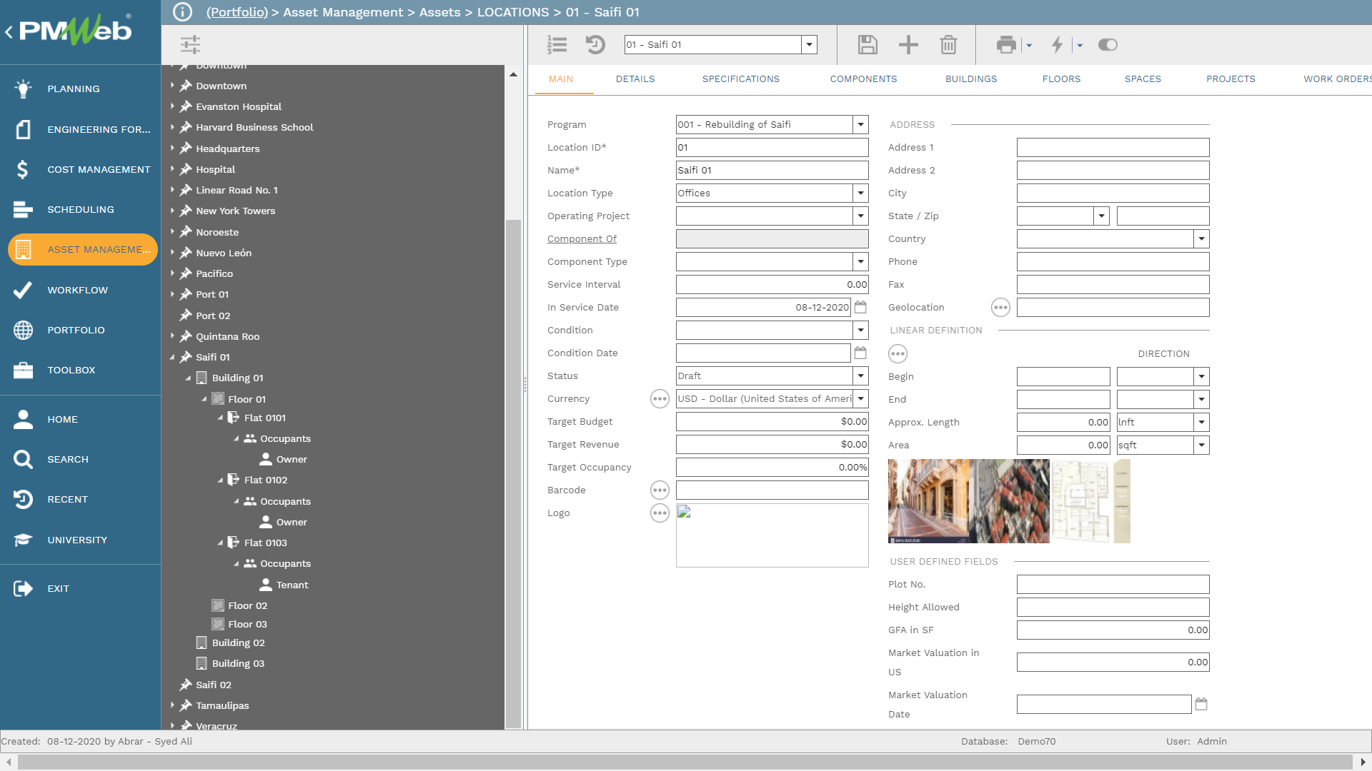 PMWeb asset location module is used to identify the details of all current locations that are in use by each public sector entity. For each location, details such as type, spatial latitude, longitude, and elevation values among many others will be captured. For each location, PMWeb can capture the details of all buildings, floors within each building, and spaces (offices, work areas, meeting rooms, information technology data centers, lobby, shop, kitchen, storage areas, etc.) at each floor level.