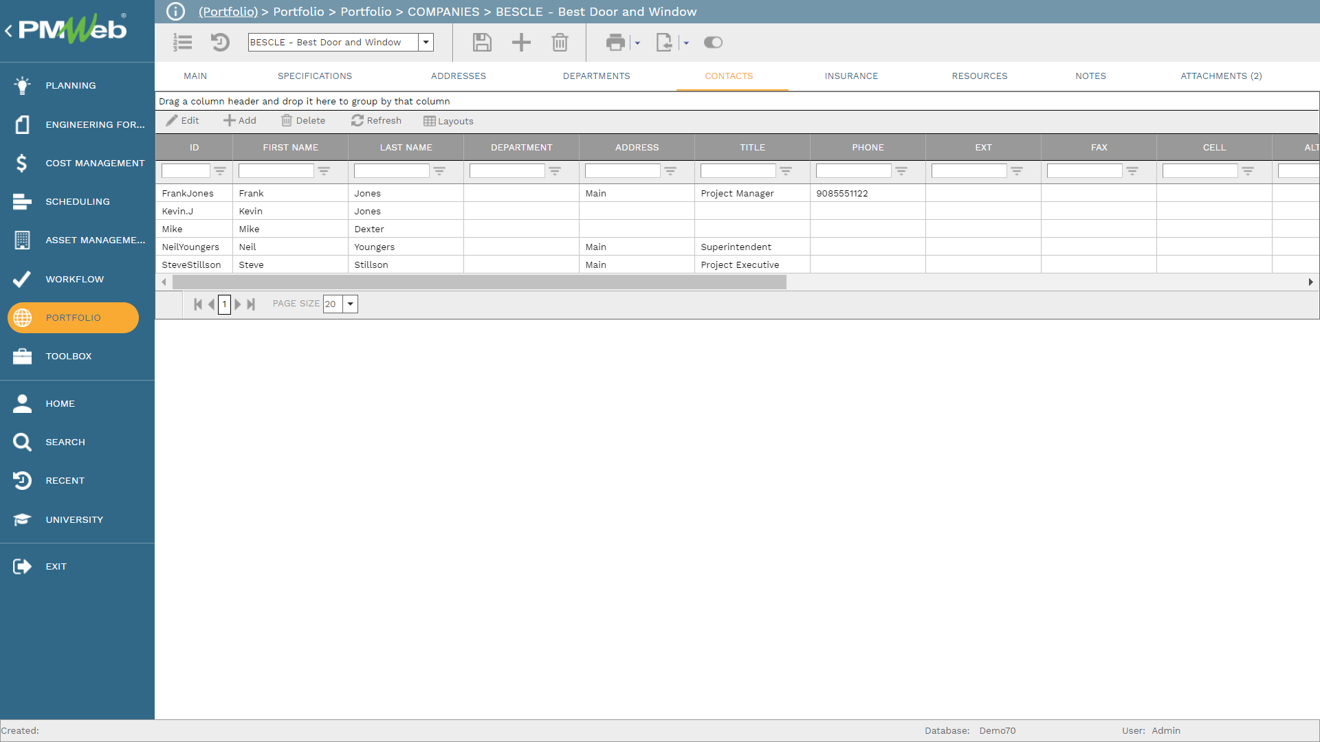 In addition, the details of all employees for each department that are located at each space need also to be captured. This is needed to enable identifying the planned as well as the actual move-out dates. PMWeb companies’ module is used to capture the details of those employees. For each employee, the employee’s name, contact details, and position among others are captured. PMWeb allows adding up to ten additional user-defined fields to provide better details on each employee if needed. Those could be for gender, nationality, and whether she/he can work from home among others.