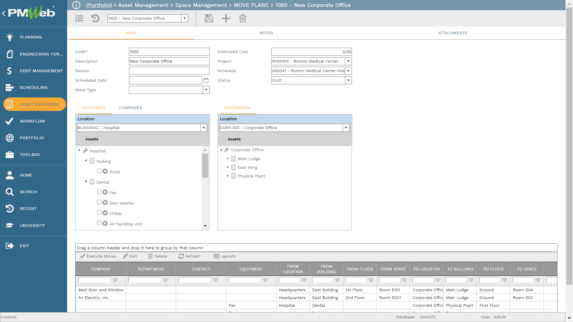 PMWeb Move Plan module allows defining the relocation plans for all those occupants and equipment assets from their current location to the new location. For each move plan, the name of the plan, scheduled date, actual date, reason for the move, move type, and estimated cost of the move will be added.