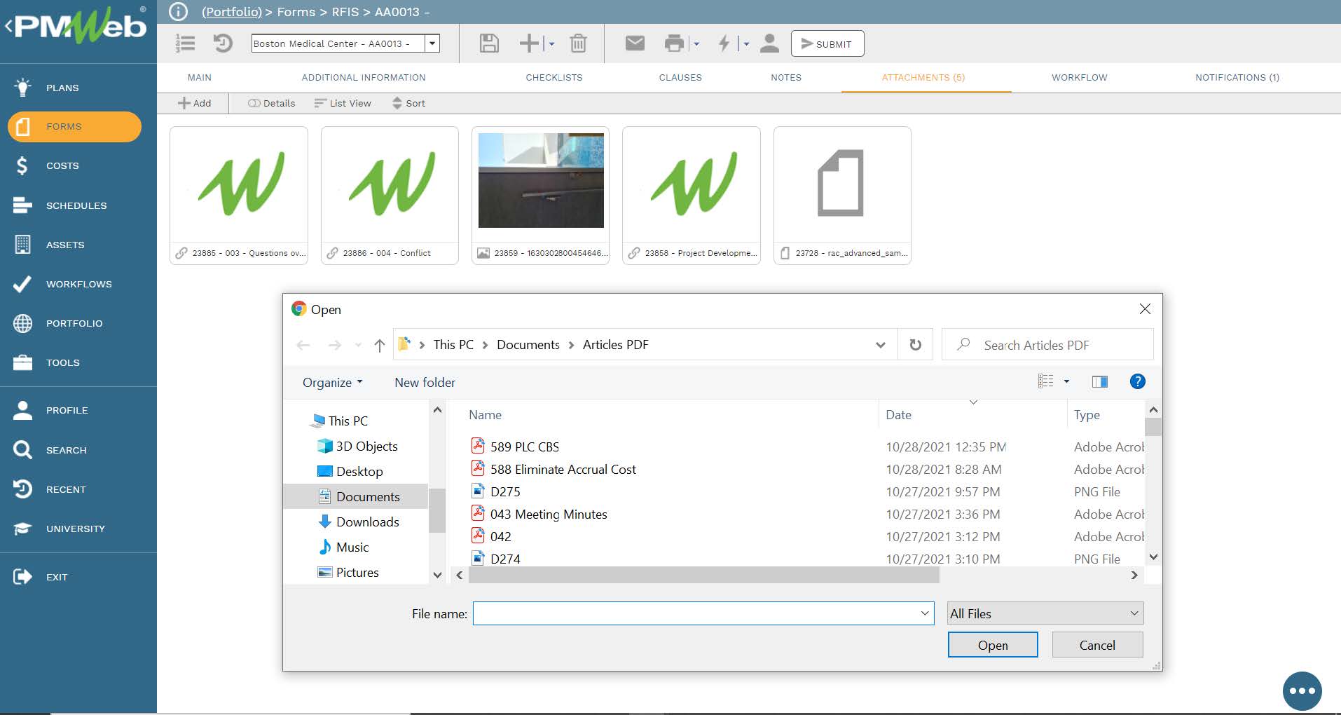 The first option for attaching documents is to upload and attach documents that could be located on any device the that user has access to. PMWeb allows uploading documents in bulk or one at a time. Although PMWeb allows attaching documents that has a file size of up to 1.9 GB per file, nevertheless, a recommended practice is to limit each file size to 250 MB or 150 MB, which continues to be large compared to most other type of communications platforms. In addition, PMWeb allows defining the type of files that can be uploaded to PMWeb which usually does not allow executable files for data security requirements.