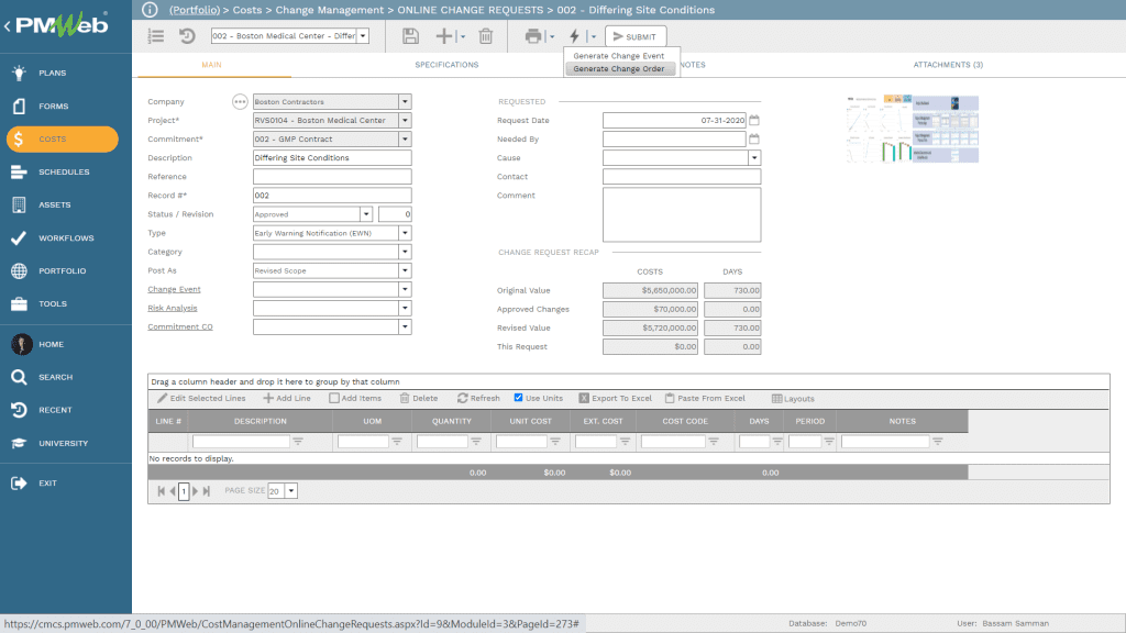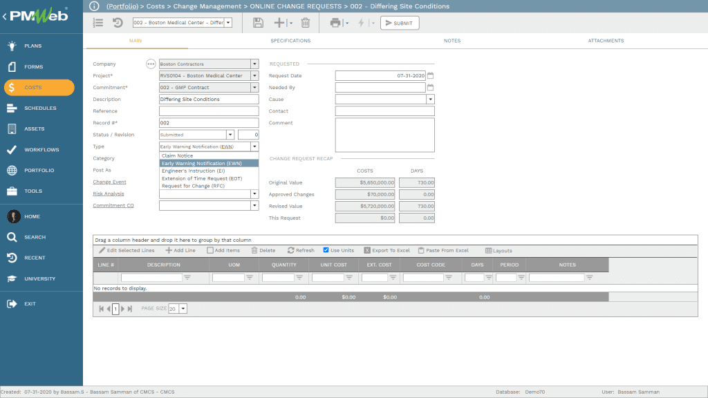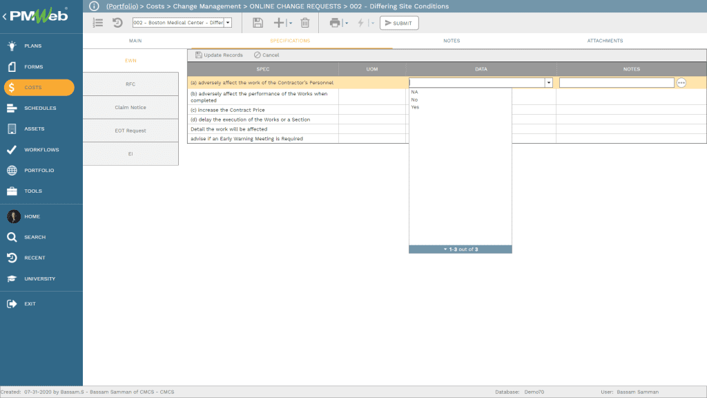 The last step for the individual submitting the potential change event is to click on the “Submit” button to formally start the process of reviewing and approving or rejecting this request. The PMWeb workflow includes conditions that are aligned with data submitted in the potential change event such as the category filed which could have the values of EWN, EOT, EI, RFC, Claim among others. Those conditions and others automatically channel the workflow review steps to the assigned project team member. The workflow steps become the basis for changing the change event status from draft to approved or rejected.