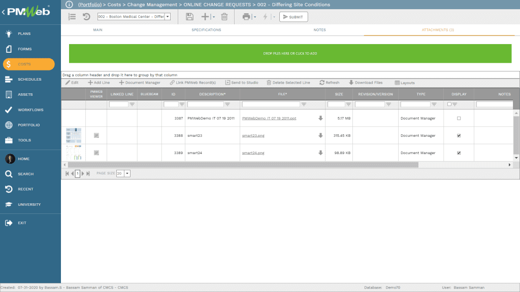 All supportive documents for the potential change event including drawings, pictures, videos, specifications among others can be uploaded direct on the form or uploaded on PMWeb document management repository before they are attached to the form. Of course, links to other PMWeb forms as well as imported MS Outlook emails can be also done.