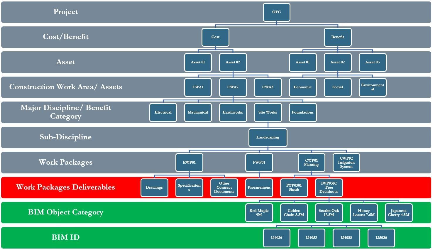 For each project, the first level of the WBS separates the project’s cost from anticipated benefits. For example, the cost side decomposes the project by assets that get created when the project is completed, construction areas, disciplines, sub-disciplines, and work packages. Each installation work package of a construction work package decomposes to the level of BIM objects included in the BIM Model. The project’s benefits decompose by the assets followed by the benefits of each asset which will be grouped by the three sustainable development impacts economic, social, and environmental.