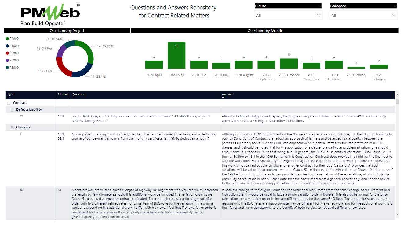 Having said so, many of the data fields are identical but also there are unique data fields that are relevant to each project management aspect. For example, the common data fields are the project name, question date, raised by who, and answered by who, subject, and status of the record. Excluding the subject, all those data fields are available from a predefined list of values.PMWeb visual custom form builder helps create the “Question and Answer” business process template. The template includes data fields that improve the learning that is shared by all those who have access to the Questions and Answers Repository Report. For example, for contract-related questions, the form should include the data fields for clauses, contract agreement type, revision, category, etc.