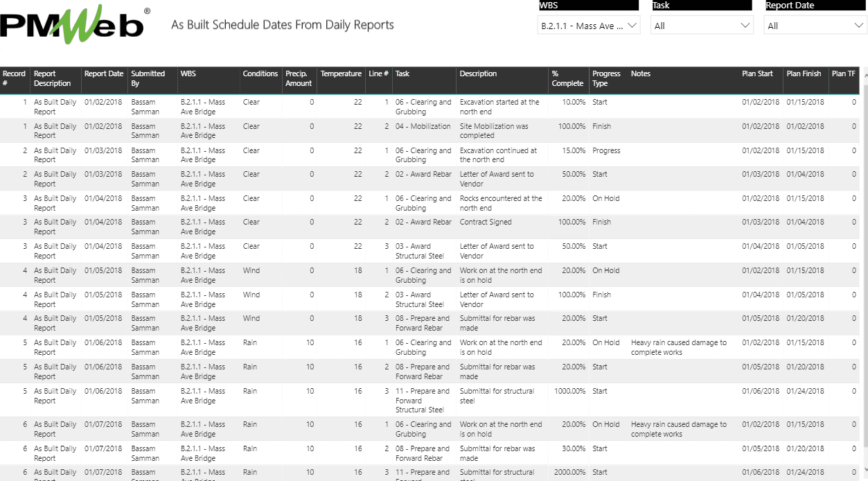 Some of the Project Management Information System (PMIS) solutions like PMWeb provides a robust and comprehensive approach for developing the as-built schedule. To achieve this, the Daily Report module will be used along with PMWeb document management repository. The first step will be to import the approved baseline schedule into PMWeb to ensure that all activities that need to be updated are available for the update. The second step will be to identify the documents and records that will be used to establish the actual start and finish dates for the project schedule activities. The third step will be to create a day by day history of what has actually happened on the project using PMWeb Daily Report module. For each daily report, there will be a need to attach all supportive records, documents and pictures to verify the reported progress. The third step will be to generate the report that will compare the as-planned dates from the originally imported schedule dates and the as-built dates captured in the daily reports.
