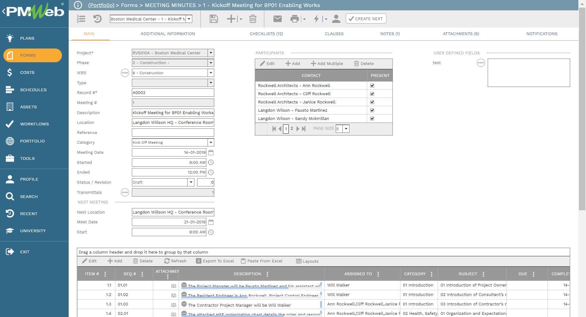 Using Project Management Information Systems (PMIS) like PMWeb all project related meetings will be captured including the kickoff meeting. The meeting minutes module is the module where design review, progress review, risk review, safety, coordination, handover, kickoff, and all other meeting types get captured. The header of the meeting minutes module captures the specific particulars for each meeting including the details of project team members invited to attend the meeting and who have attended the meeting.