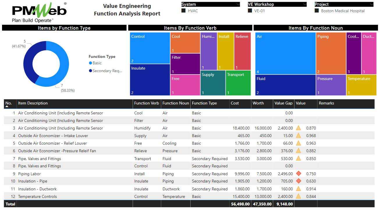 Using Project Management Information System (PMIS) solutions like PMWeb, the different value engineering business processes, as well as value engineering phases checklists, will be managed as well as associated documents with those processes will be uploaded and stored in PMWeb. This will not only ensure that the value engineering processes are performed as required but also enable monitoring, evaluating, and reporting on the results of each value engineering process. The function analysis report is one of those examples.