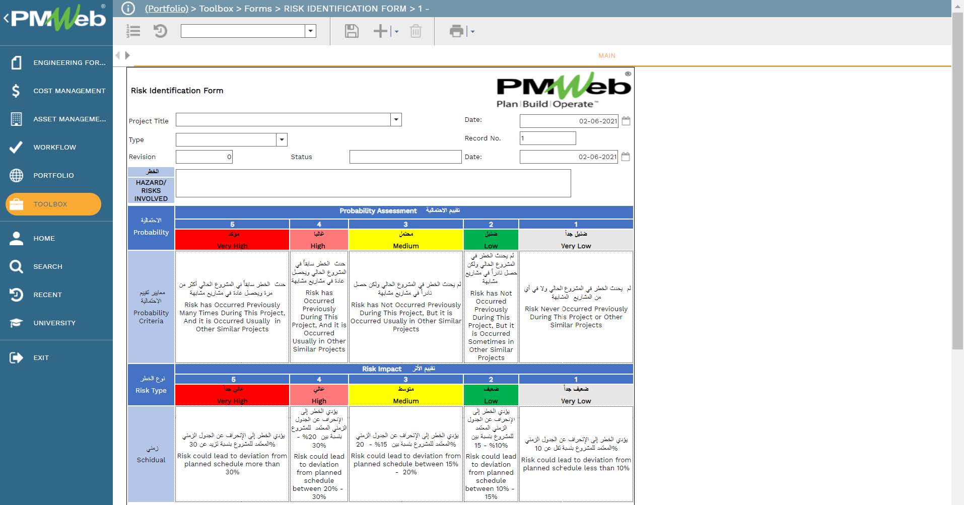 Using a 100% Web-Enabled Project Management Information System (PMIS) solution that allows customizing project management business processes like PMWeb will fulfill this requirement. PMWeb visual custom form builder will be used to create the Risk Management input form that each individual can access anywhere, anytime using any device. The form will include the fields needed for identifying, quantifying, and responding to project risks. Nevertheless, what is more important in the form is that it will provide a detailed visual explanation of how to identify and quantify those risks in the languages that are used on the projects’ portfolios. Those standards and associated details should be aligned with the company’s project risk management plan.The Risk Management form will include the fields for the project name, date identified, and risk category. In addition, it will include the fields for the risk name, description, and its likelihood to occur and the impact it could have on the project if it occurs. Those assessments will be provided on a scale of 5 points that will be explained in the form.