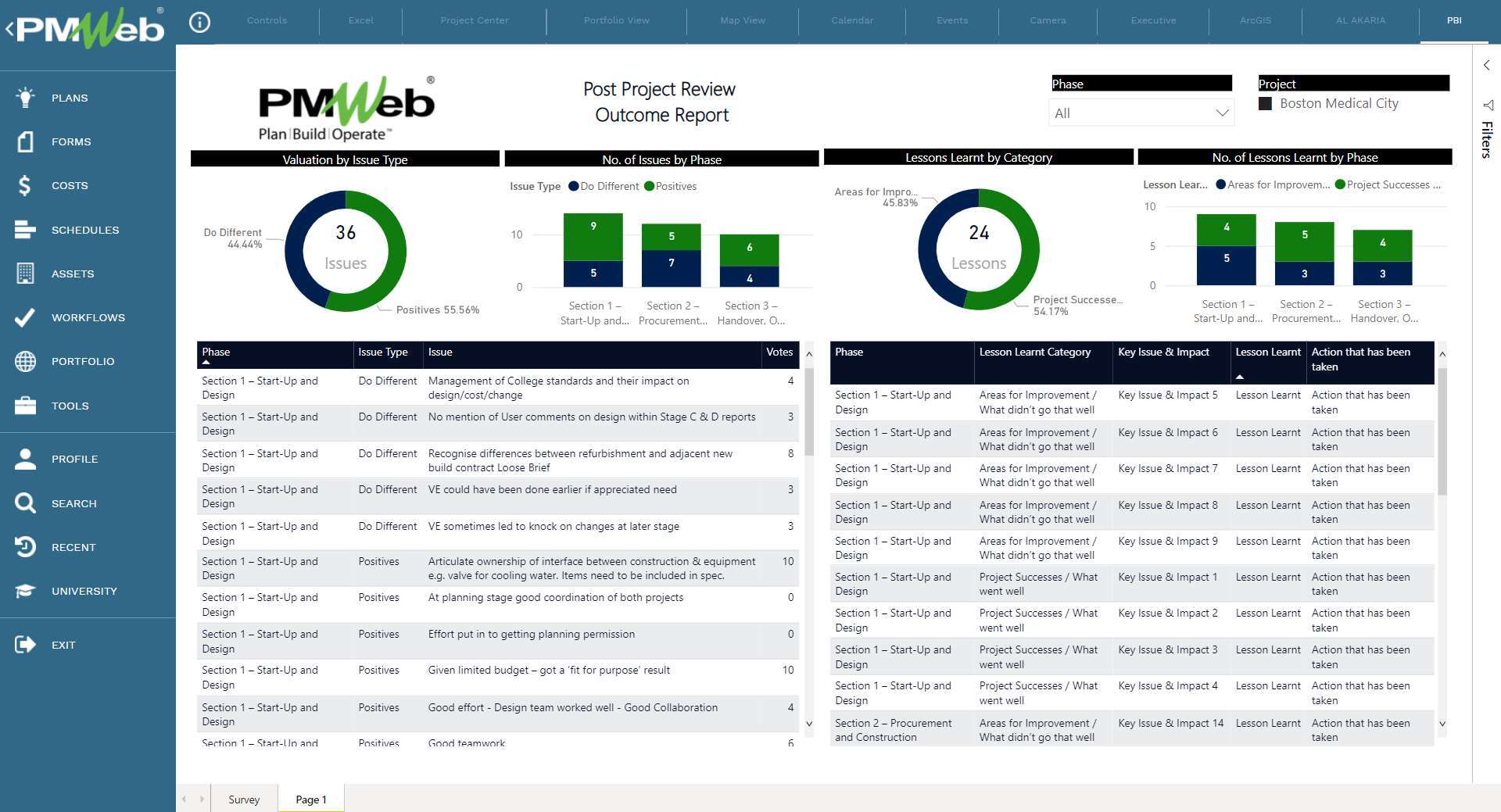 Using Project Management Information Systems (PMIS) like PMWeb, the project management team can improve the Post Project Review (PPR) process. PMWeb custom form builder allows the creation of the Pre-Workshop Questionnaire form which should encourage project participants to think about the significant issues of a project before the PPR workshop. For example, the questionnaire could include sections that are relevant to the project start up and design, procurement and construction and handover, operation, and user perspective phases. Each question in the form will be assessed using a scale of “4” where “1” is significant room for improvement, “2” is room for improvement, “3” is good, and “4” is very good.
