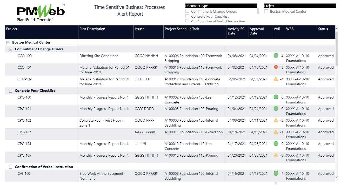 Therefore, it is a must requirement that the template for those business processes includes a field to associate each transaction with its relevant project schedule activity. This will be the activity that could be delayed if the transaction closure was delayed. Usually, the activities to be associated with each transaction need to be from the current updated project schedule to reflect the current start and finish dates of those activities. For construction projects, usually, the project’s baseline schedule and subsequent progress updates are done using the Primavera P6 scheduling tool.By having the project schedule activity associated with each transaction of those time-sensitive business processes, the reports or the registers for those business processes can be designed to have the project schedule activity as one of the fields to be reported on. This enables creating calculated fields to show if the closure of each business process transaction was done before the due start date of the associated activity or not. The report provides real-time alerts of all business process transactions that could delay the project and the party accountable for the delay. The report shown is an example of a report that lists transactions of all time-sensitive business processes to identify those transactions that could have impacted the project’s completion milestone dates.