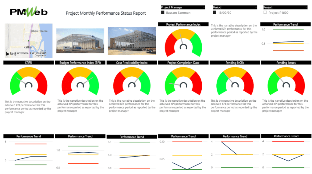 By having the formally approved progress data submitted for the current progress period, PMWeb can be used to create the project’s monthly performance report. The report displays the score values for KPI for the current period in the format of a tachometer along with the narrative provided by the project manager or any other assigned project team member to provide the report reader an insight into the KPI performance. Since PMWeb captures and stores the KPI score values for all progress periods, a three-month trend chart can also be added for tracking the KPI. The trend chart shows the pre-agreed performance tolerance levels as green for favorable performance, cyan for average performance, and red for unfavorable performance. At the summary level of the progress report, which display the Project Performance Index KPI, the report could display the geospatial location of the project on the ESRI map and the progress photographs for the current period.