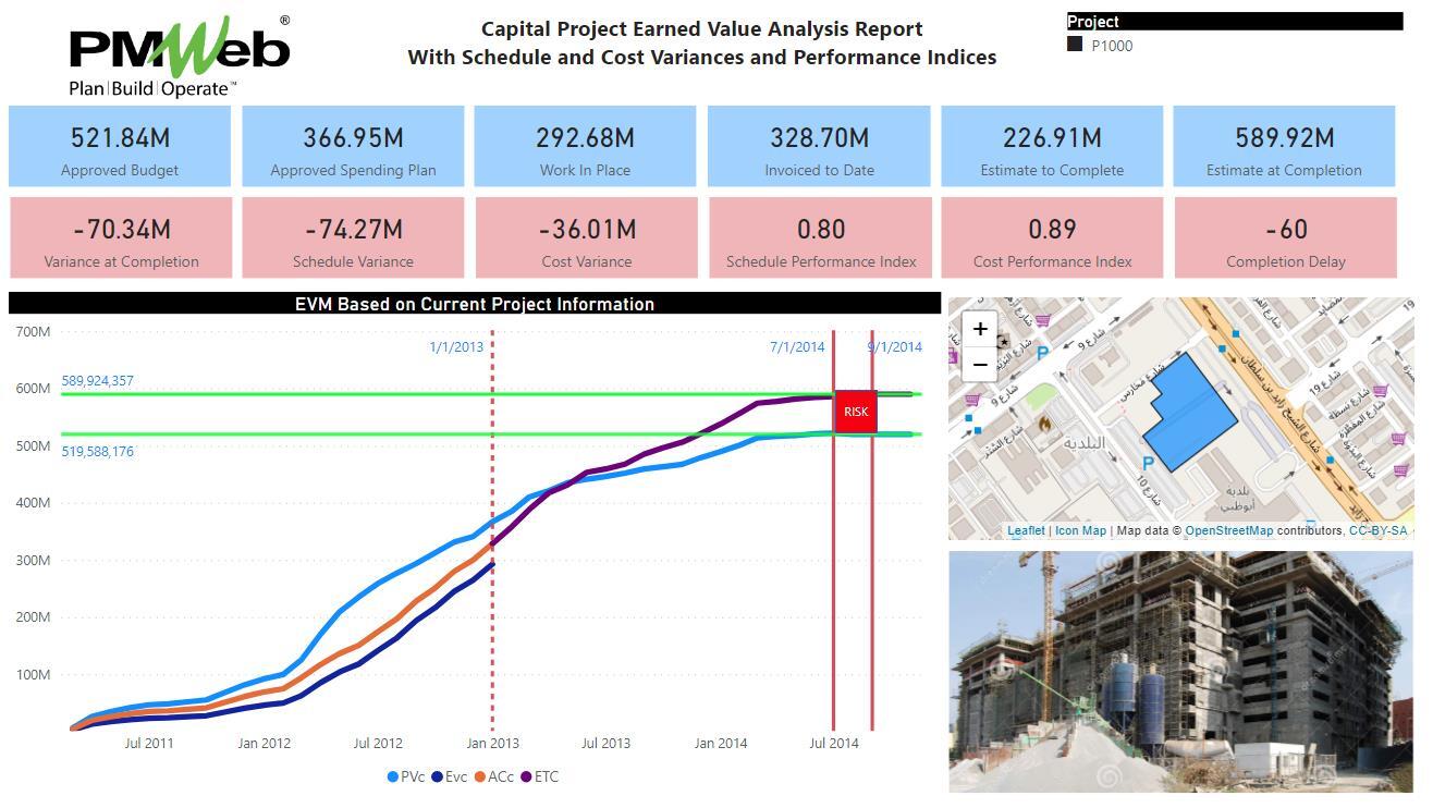 Accordingly, a report can be designed to communicate each project cost and schedule performance status in a language that is best understood by project stakeholders. The report could include a map to show the boundaries of the project as well as a picture to show the current project’s construction status. The report also includes scorecards for each one of the EVM measures as well as the project’s total float value. The measures for Variance at Completion (VAC), Schedule Variance (SV), Cost Variance (CV), Schedule Performance Index (SPI), Cost Performance Index (CPI), and Total Float (TF) are colored either “Green” for when performance is ahead of what is planned, “Yellow” for when performance is borderline or “Red” for when the planned performance is behind. The report also includes a line chart that displays the curves for Planned Value (PV), Earned Value (EV), Actual Cost (AC), and Estimate to Complete (ETC). The report includes threshold lines for Data Date, Budget at Completion (BAC), Estimate at Completion (EAC), Planned Finish Date, and Current Finish Date. In addition, it is recommended to add a rectangular box to highlight the project’s current risk for cost overrun and delayed completion. The report has a filter to enable selecting the project to be reviewed. Of course, the report layout can be modified to display other performance information that could be required by the stakeholders.