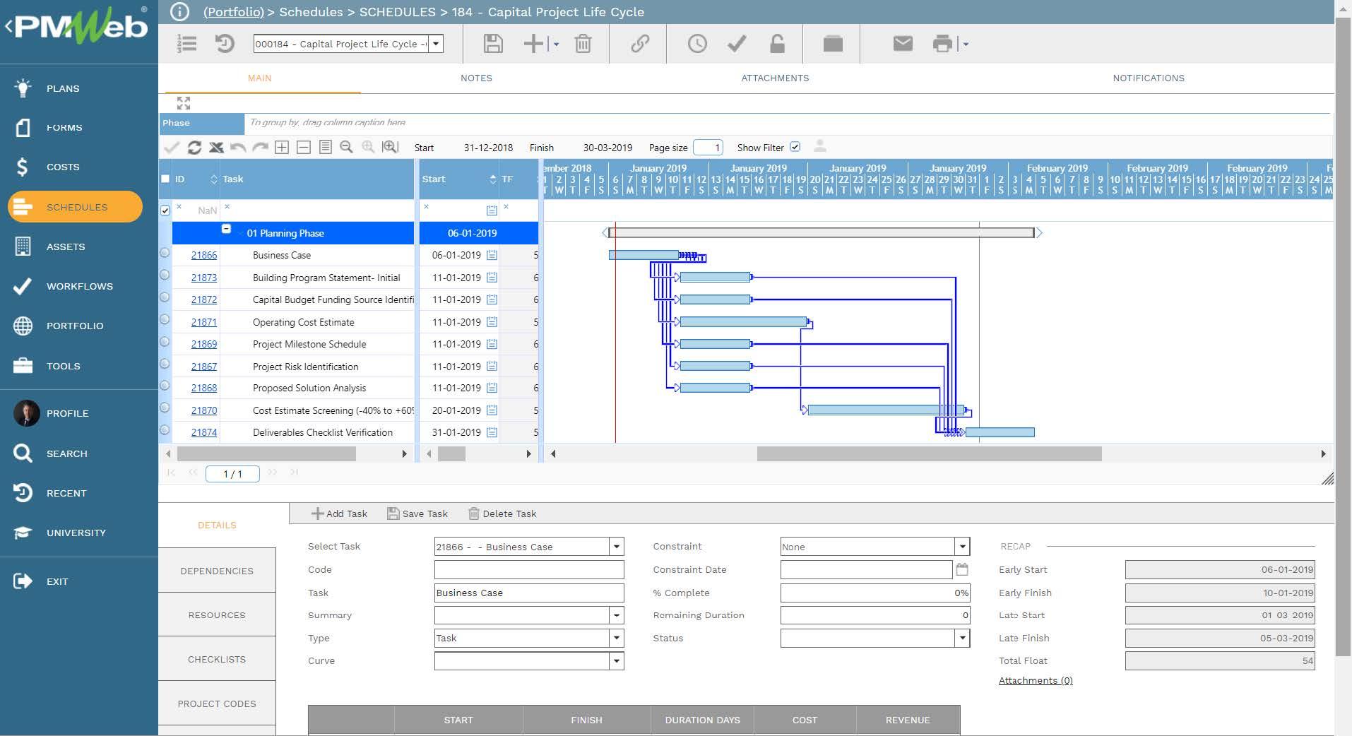To start with, the PMWeb scheduling module will replace the use of MS Excel by providing a quick and easy tool to create project schedules. It allows adding activities, dependencies, constraints, working calendars and automatically calculates activities early and late start and finish dates as well as float value that an MS Excel-based schedule cannot do. In addition, it allows to resource and cost load the activities as well as capturing the actual start and finish dates, percent complete, and remaining duration for progressed activities.