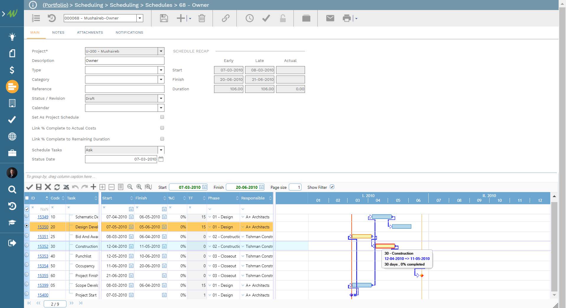 PMWeb scheduling module will be used to create the milestone schedule that each Property Executive needs to adhere to when it comes to signing the target tenants or buyers. This enables managing, monitoring, evaluating, and reporting the schedule performance. The level of schedule details should be aligned with the desired level of control. Activities in the revenue project can be linked to activities in the execution project in case there is a dependency between those activities. The project schedule needs to be updated on a regular basis for which the baseline and periodical updates will be saved to enable reporting on them when needed.