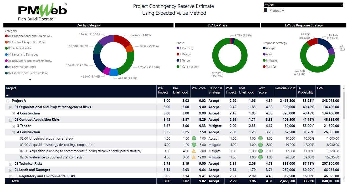 The project contingency reserve estimate using the Expected Value Method report is generated from the data captured in PMWeb risk analysis registers created for the project risk category. The report groups the risks identified under each risk category by the project phase it belongs to. It details the pre-mitigation risk impact and occurrence likelihood and risk score, selected risk response strategy, post-mitigation or treated risk impact and occurrence likelihood and risk score, residual risk value, probability of occurrence, and the risk expected value. The report includes three donut visuals to summarize and group the expected value of the project contingency reserve by risk category, project life cycle phase, and selected risk response strategy to treat the risk. The interactive report adjusts the risk register display depending on the risk category, project life cycle phase, and/or risk response strategy selected.