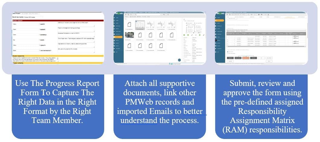 The importance of capturing progress report data and any other project management data using a PMIS like PMWeb is that it helps the organization not only in maintaining the historical data of past performance across their complete projects portfolio but enforces governance in capturing and reporting this performance data. The monthly progress form along with all supporting attachments submits through a pre-defined review and approval process thus enforcing governance, transparency, and accountability and having real-time trustworthy data to report on.
