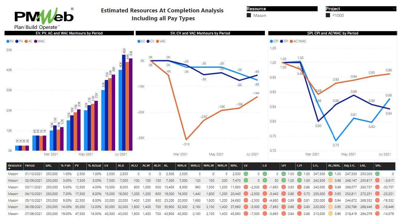 When it comes to reporting labor resources planned, earned, and actual performance, it is recommended that this be based on manhours rather than monetary values. Not only this will enable benchmarking resources’ performance on a single as well as complete projects’ portfolio, but we all know that the actual cost will be always provided by the contractor’s own financial system. Therefore, the pay types for labor resources will be standardized for all labor resource types. For example, the regular hours pay type amount will be 1.0, overtime 1.2, weekend 1.5, holiday 2.0, and so on. In other words, assume that a Mason resource spent during a period 200 regular, 40 overtime, 20 weekend, and 10 holiday hours. Then the actual spent 270 resource manhours spent by the Mason resource will be reported as 330 resource manhours. This is known as the weighted actual resource manhours (WAC).The actual manhours and weighted actual resource manhours will be used to calculate an index (AC/WAC) that will be used to adjust the estimate to complete (ETC) resource manhours which is by default the difference between the budget at completion (BAC) the earned value (EV) for each resource. The adjusted estimate to complete (Adj ETC) will become the basis for calculating the estimated at complete (EAC) which is the sum of the adjusted estimate to complete (Adj ETC) and the weighted actual resource manhours (WAC). The difference between the budget at completion (BAC) and the estimated at complete (EAC) will be the variance at completion (VAC).