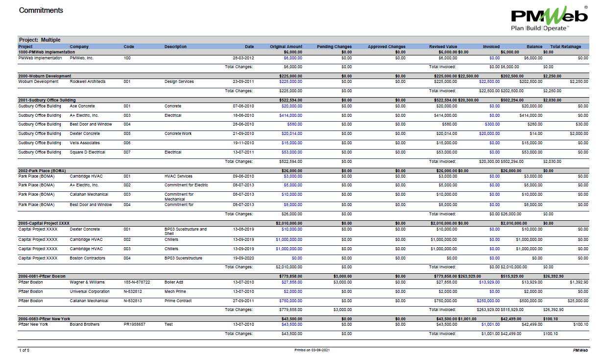 The first reporting requirement would be to have a single version of the truth of every single contract awarded on the complete projects’ portfolio that an entity could have. For each contract, the information to be displayed would be the vendor’s name, contract name, date, original value, approved changes, revised total, invoiced, balance and retainage. The contracts can be grouped by project, vendor, or any other contract field.
