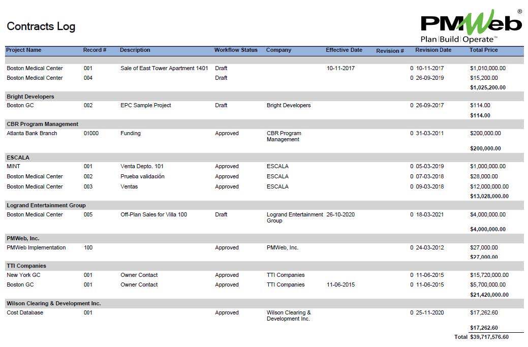The second objective of using a PMIS like PMWeb is how such a solution can immediately fulfill the revenue contract management monitoring, evaluating, and reporting requirements of the projects’ stakeholders. Using PMWeb ready-to-use revenue contract management processes and the out-of-the-box stock of forms, reports, and dashboards, the needed reporting will become immediately available. Of course, those forms, reports, and dashboards can be fully customized and altered to fulfill any formatting or branding requirements when needed.The first reporting requirement would be to have a single version of the truth of every single revenue contract signed or being enforced on the complete projects’ portfolio that an entity could have. For each revenue contract, the information to be displayed would be the vendor’s name, contract name, date, original value, approved changes, revised total, invoiced, balance and retainage.