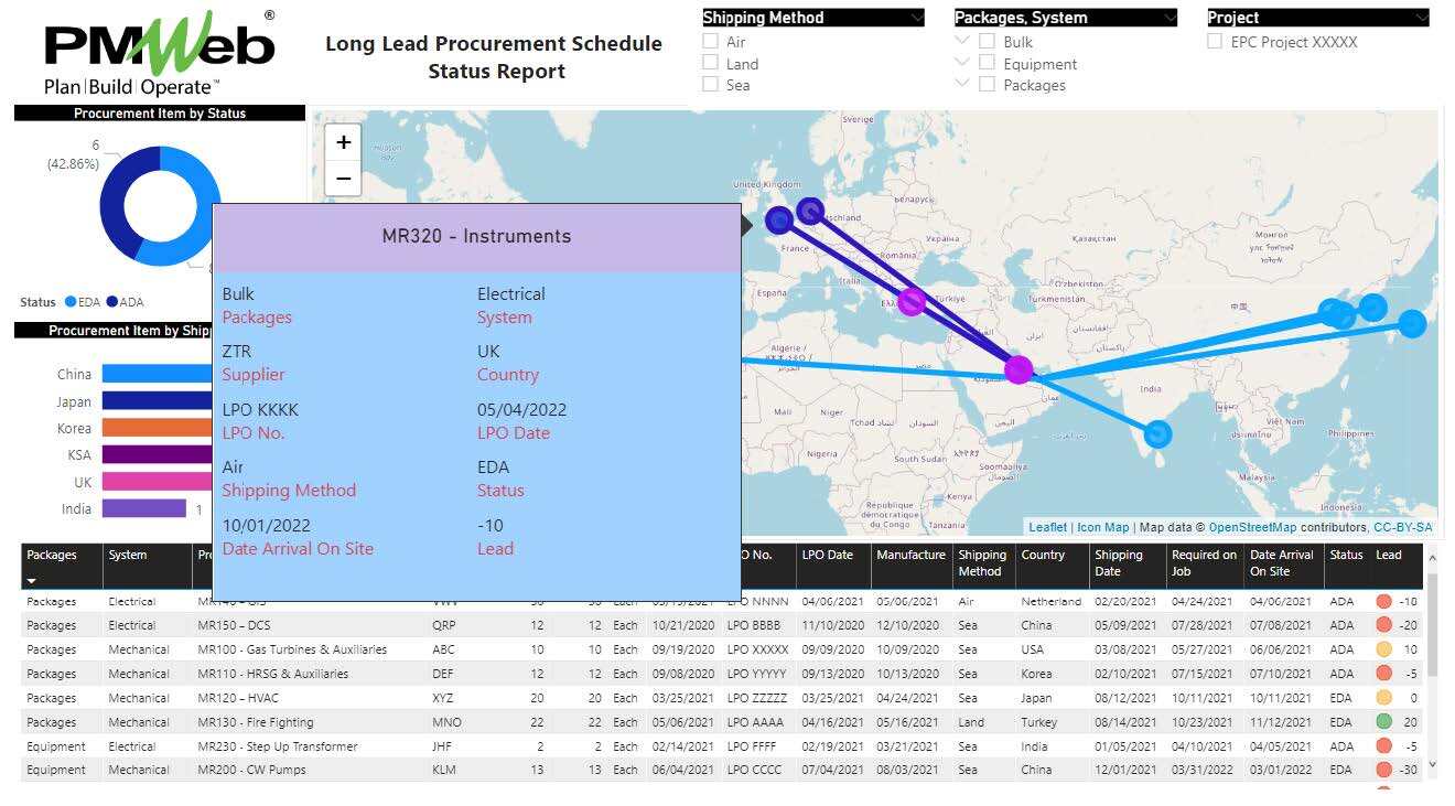 The reader of the Long Lead Procurement Schedule Status Report can drill down to any specific procurement item to have full details on its full shipment history status as well as other details that might not be captured at the status report. The report will include a map that will display the shipment status of the equipment on a map showing the current status, past shipment history, and planned route to the project site.