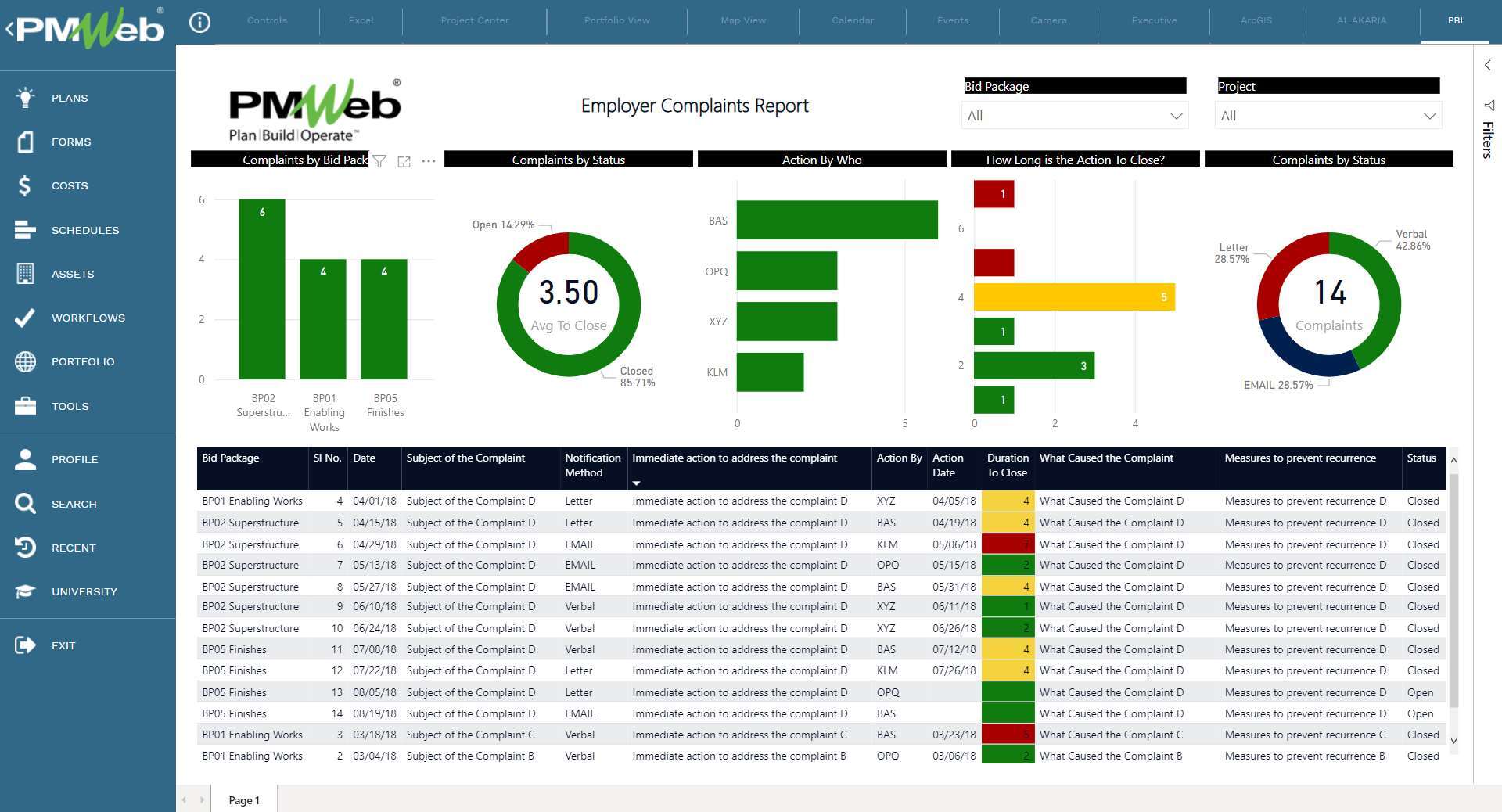 The Employer Complaint Report maintains a real-time register of all complaints raised on the project showing the details captured in the Employer Complaint form. The form has visuals to show the status of all Employer Complaints, employer complaints by bid package, and the average time taken to close those complaints.