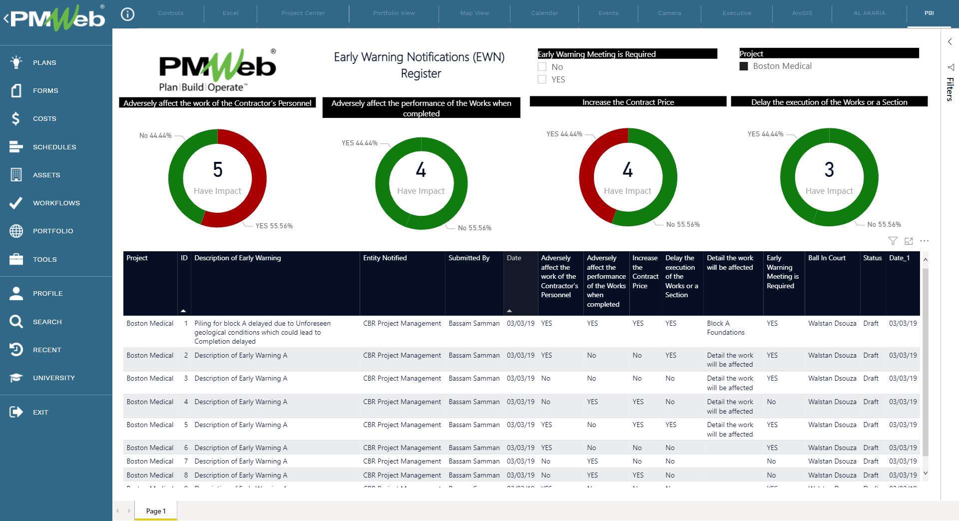 Using Project Management Information Systems (PMIS) like PMWeb can be used to formalize the process for managing Early Warning Notifications (EWN) or Advance Warning (AW). PMWeb custom form builder will be used to create an EWN form which will include the needed fields for the form. Those include a Description of Early Warning, details if the Early Warning is likely to (a) adversely affect the work of the contractor’s personnel; (b) adversely affect the performance of the Works when completed; (c) increase the contract price; and/or (d) delay the execution of the works or a section (detail the work will be affected), and advise if an Early Warning Meeting (EWM) is required. The form also includes a field with the name of the project entity to the EWN is issued to.