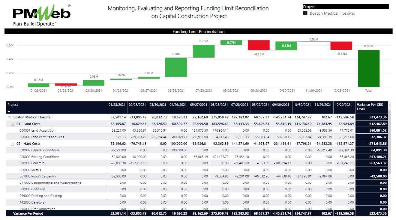 For each capital construction project, the PMWeb budget module captures the baseline module as well as all budget adjustments and transfers. In addition, the PMWeb commitment module captures the details of all awarded commitment contracts. The commitment change order module is used to capture all changes to the commitment contracts. Both budget and commitment modules allow the project team to define the projection for each cost center. The budget defines the available fund limit whereas the commitment defines the spending requirement for each commitment contract. The difference between those two values defines the funding limit variance for each period.