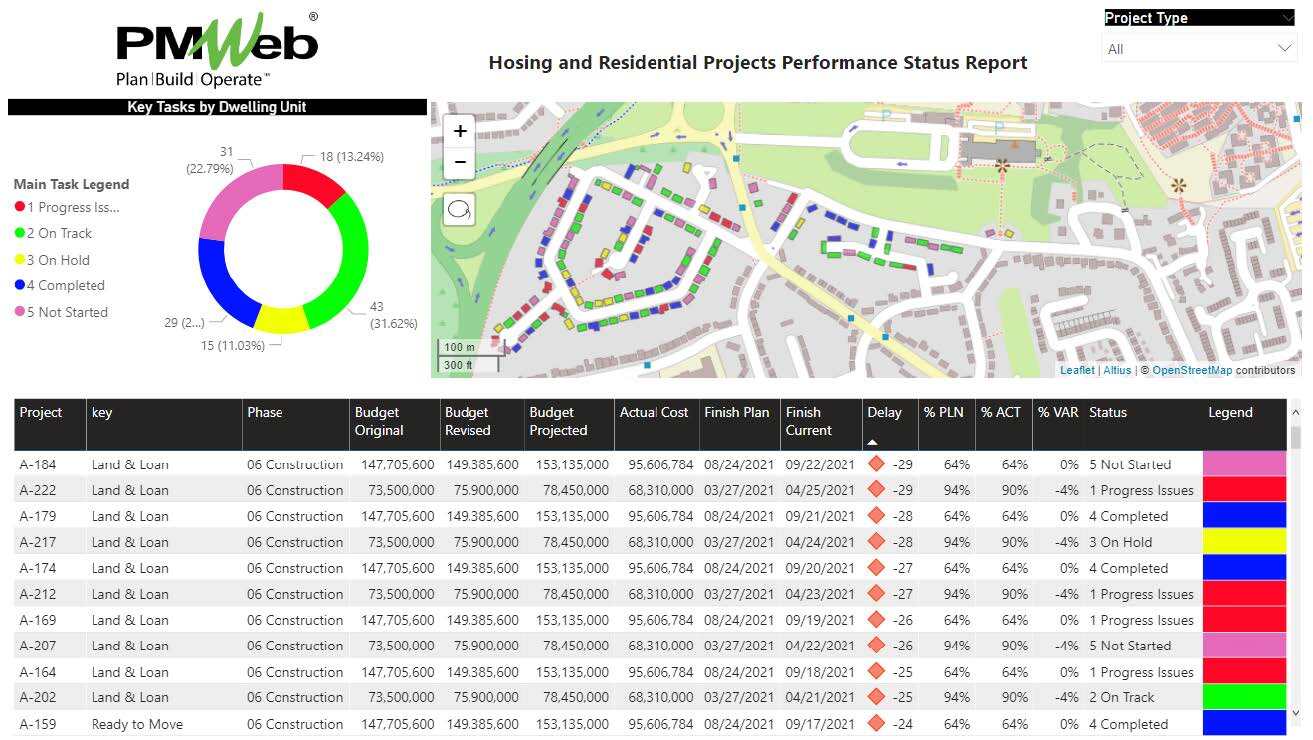 The performance report enables the reader to select projects by their performance status which could be progress issues, on track, on-hold, completed, or not started as well as projects by a delivery method which could be the plot of land and zero-interest loan to build the house or provide read-to-live houses or apartments. Of course, there is no limit on what selection filters to add or the design of the report.