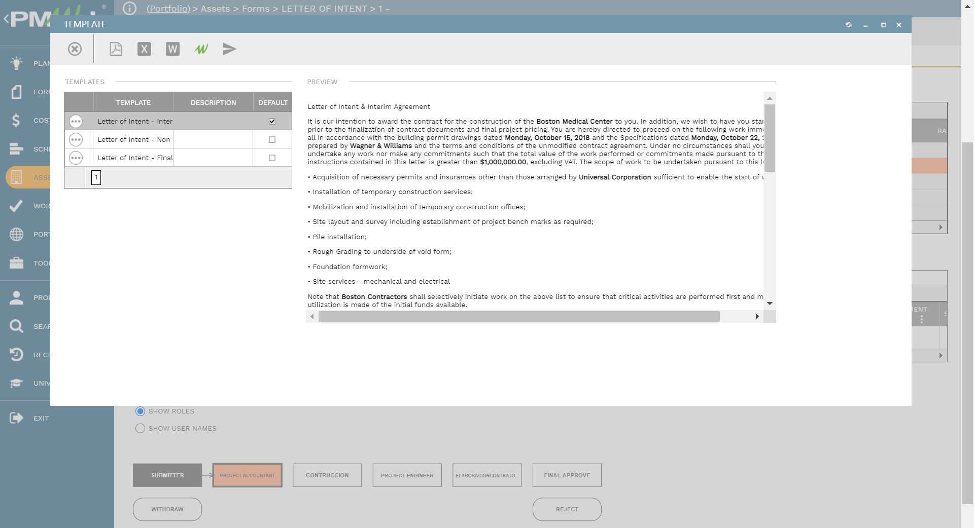 PMWeb Word module will be used to create the different letter of intent templates whether the “LOI” is intended to be a non-binding statement, interim agreement, or final contract. For example, since we have selected in this example the “LOI” type of an interim agreement, then the project team member responsible for issuing a formal letter of intent to be wet-signed and stamped will select that “LOI” output template. All fields in the “LOI” will be automatically filled and the letter will be print merged in MS Word.