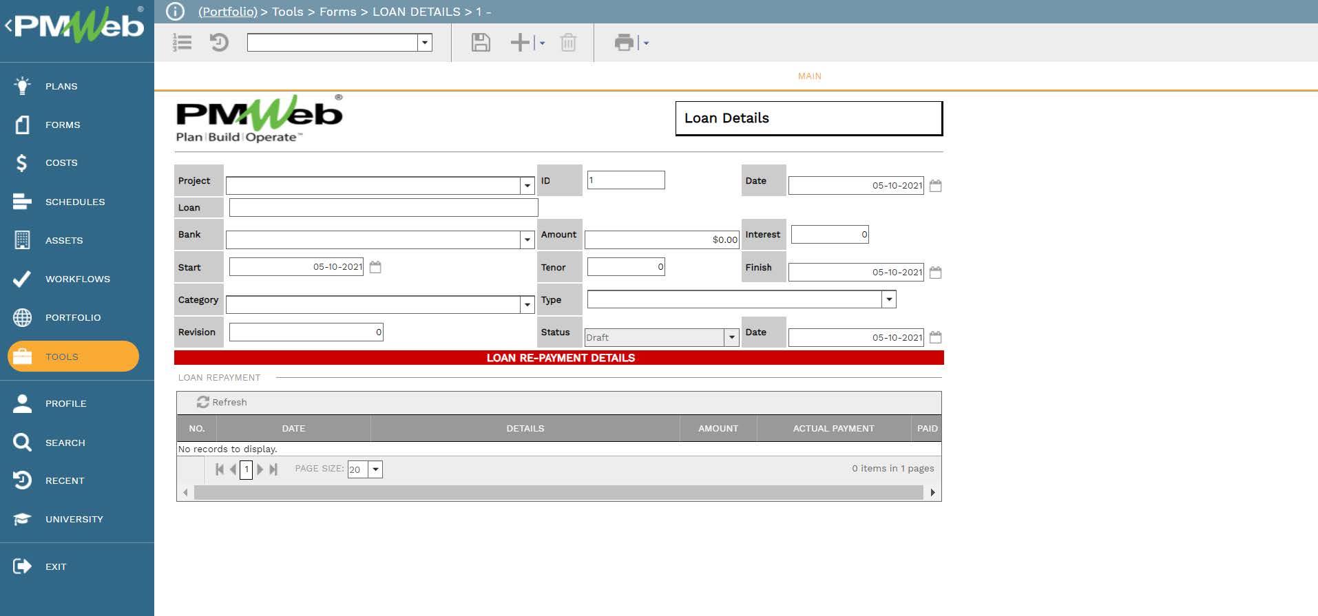 To capture the detail of all loan agreements that the real estate investor has used to finance the real estate investment, the PMWeb custom form module helps capture the details of each loan. The template includes the financial institution providing the loan, loan amount, interest rate, payment terms, loan tenor duration, loan start, and end date, etc. In addition, the template will include a table that will show the due loan repayments amounts and dates, and actual repayments are done. Of course, the template can be designed in any desired format to capture all needed details by the real estate investor.