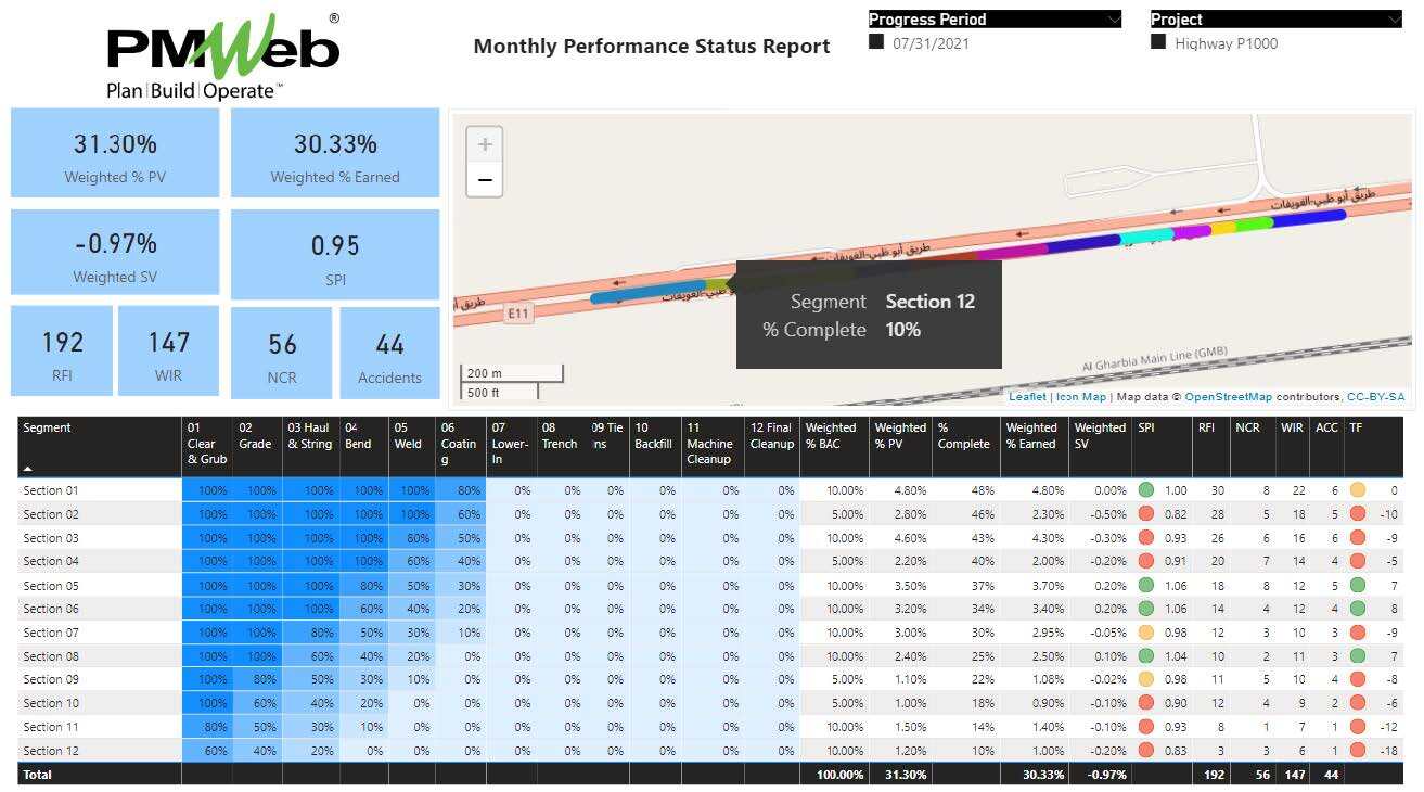 For executive stakeholders of entities involved in delivering linear capital construction projects, they are always keen to have a single-page report that gives them an easy-to-read and understand single version of the truth of how a project is performing. Linear projects include highways, roads, railways, metros, gas, oil, water, wastewater pipelines, services tunnels, culverts, and transmission lines. Usually, those projects include multiple segments or sections for which the activities performed at each segment or section are identical. The number of those activities, which depends on each linear project type could vary between 10 to 20 activities.