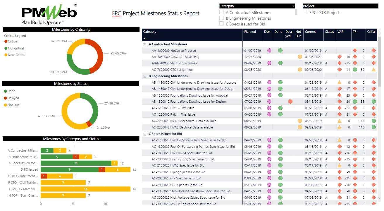 This will enable generating the milestone schedule status report in any desired form or format. For example, the report can detail completed milestones, due but delayed milestones, and milestones that are not due yet. In addition, milestone trend reports can be also created as the data for all interim updates are captured in the PMWeb database repository.