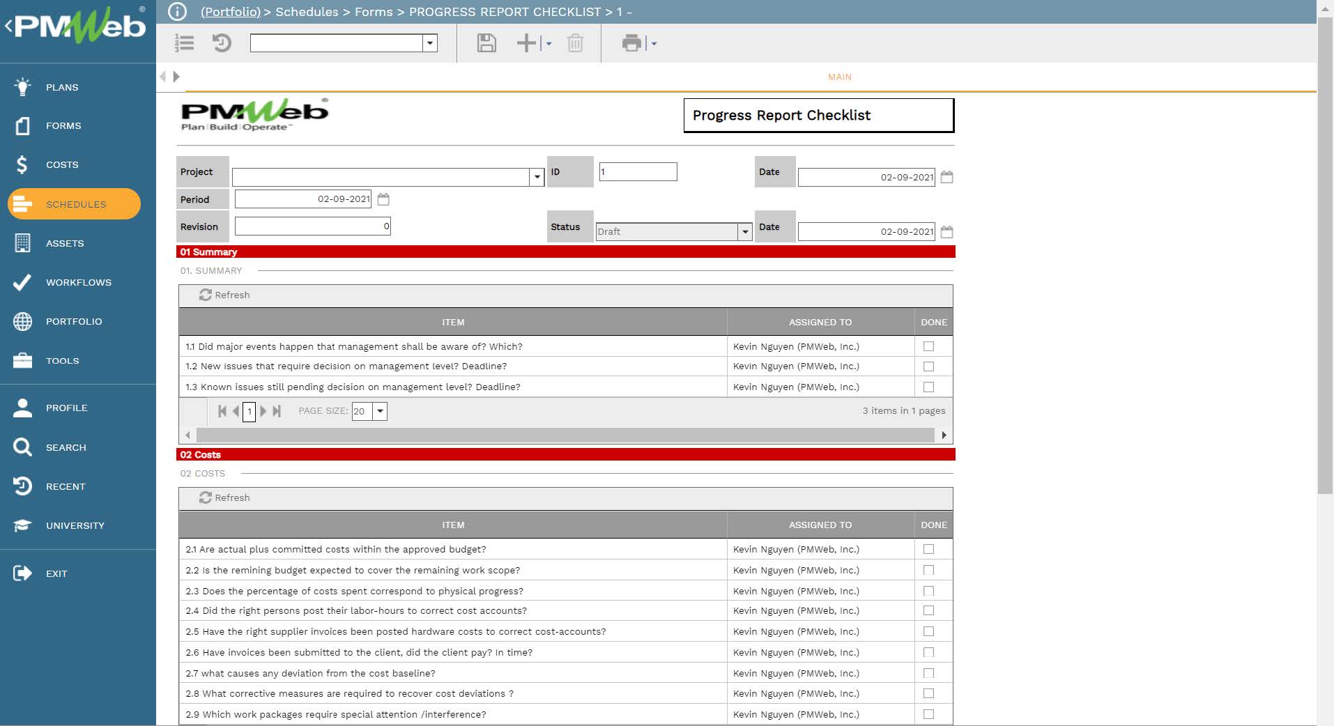 A Project Management Information System (PMIS) like PMWeb will be usually used to digitize the hundred-plus business processes by providing the input template to capture the needed data and the workflow to enforce formal collaboration as defined in the project management plan while incorporating the authority approval levels associated with each business process. In addition, PMWeb can also be used to create a template to formalize the review of the sixty-five questions for the monthly progress report.The Progress Report Checklist is created with the PMWeb custom form builder. The report has twelve tables for which different access permission rights can be assigned for each table if required. Each table includes the items to be checked, checked by who and confirmation of the check was done or not