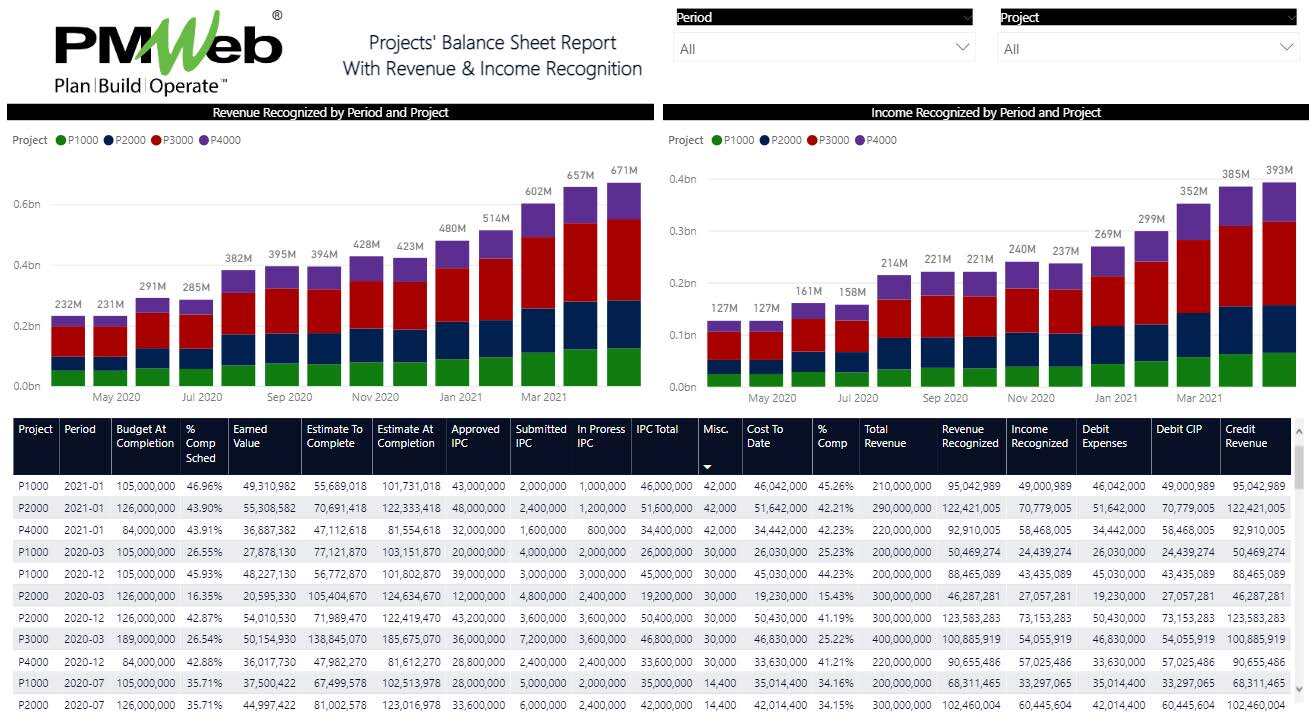 For example, for each financial period the Actual Cost includes all submitted and approved interim progress invoices, all submitted but not yet approved interim progress invoices, and all approved work in a place that us not yet been submitted. On the other hand, the Estimated Completion Cost includes the Actual Cost plus the Estimated Cost to Complete the current approved revised project budget for the remaining scope of work. This enables to automatically calculate the Percentage of Completion by dividing Actual Cost to Date over the Estimated Completion Cost. The Revenue Recognition amount is automatically calculated by multiplying the Percentage of Completion with the Total Estimated Revenue value. The Income Recognition is the difference between the Revenue Recognition and Actual Cost amounts.For the Balance Sheet, the Actual Cost amount is recognized as Debit Expenses, Income Recognized as Debit Construction in Progress (CIP), and Revenue Recognition as Credit. This ensures a zero-balance sheet. This information is for the real-time single version of the truth Revenue and Income Recognition report.