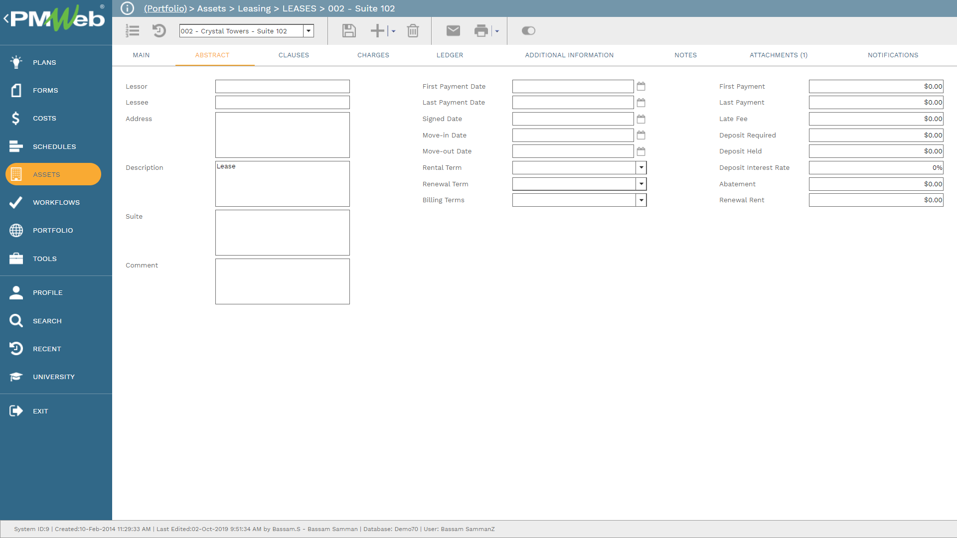 In addition, for each lease agreement, the abstract tab allows the property owner to capture more details on the lease such as the lessor and lessee, first payment date and amount, last payment date and amount, signed date, move-in and move-out dates, rental term, renewal term, and billing terms, deposit held, required and interest date among others.