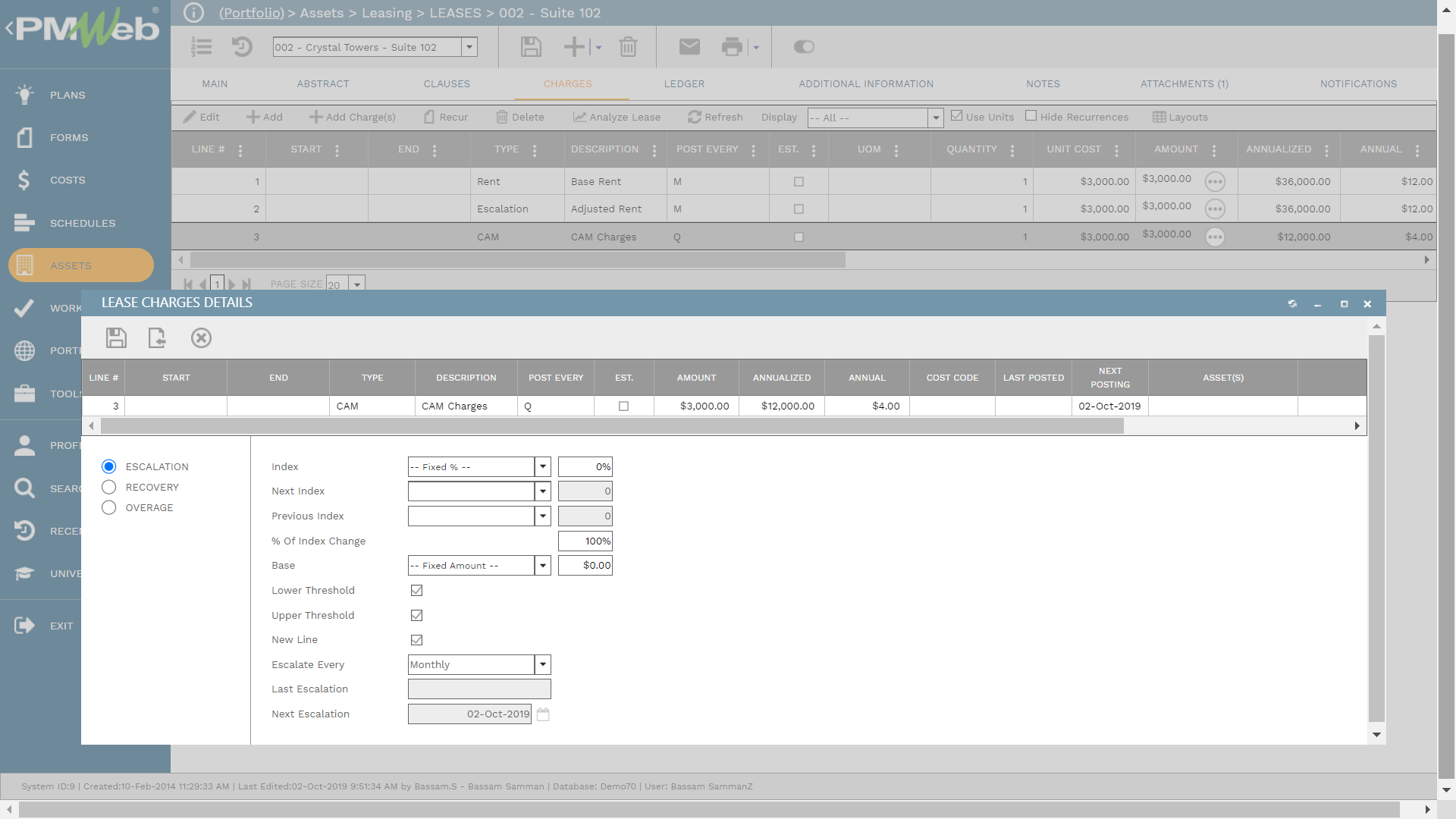The lease agreement also includes details of all basic charges and advanced charges for escalations, recoveries, and overcharges. PMWeb allows the property owner to create unlimited charges to be applied to the lease throughout its life. Escalations are adjustments to charges – up or down – over the lifetime of a lease, which can occur once or reoccur periodically. They can escalate by fixed percentages and amounts or be tied to Consumer Price Indexes (CPI).