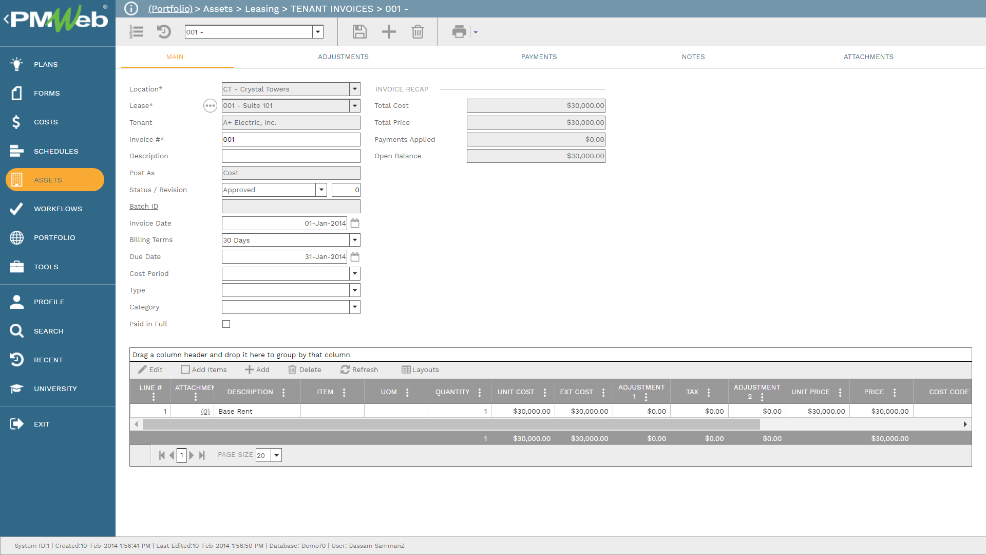 The PMWeb Tenant Invoices module allows adding tenant invoices manually or automatically by posting the Lease Administrator batches. Tenant Invoices appear in the Leases module Ledger Tab and Payments can be applied to them. Tenant Invoices require the property owner to select a Location and a Lease. They feature a Due Date field (making aging reports possible) and a Cost Period field (for financial reports). If a Cost Code is selected, lines in the Tenant Invoice Details Tab Table are posted to the Cost Ledgers.