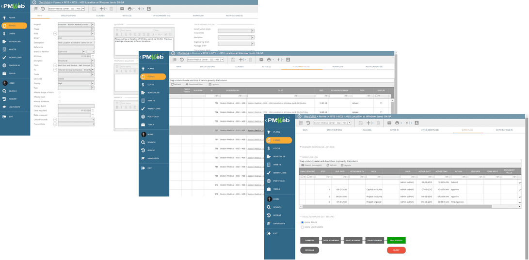 Other processes like those for value engineering proposal, claims, and others when needed, PMWeb custom form builder will be used to create the input form for those additional processes. Each form will be assigned a workflow to map all submit, review and approve tasks along with the conditions for approval authority levels. In addition, the PMWeb document management repository will allow uploading and attaching all supportive documents required when performing those processes.