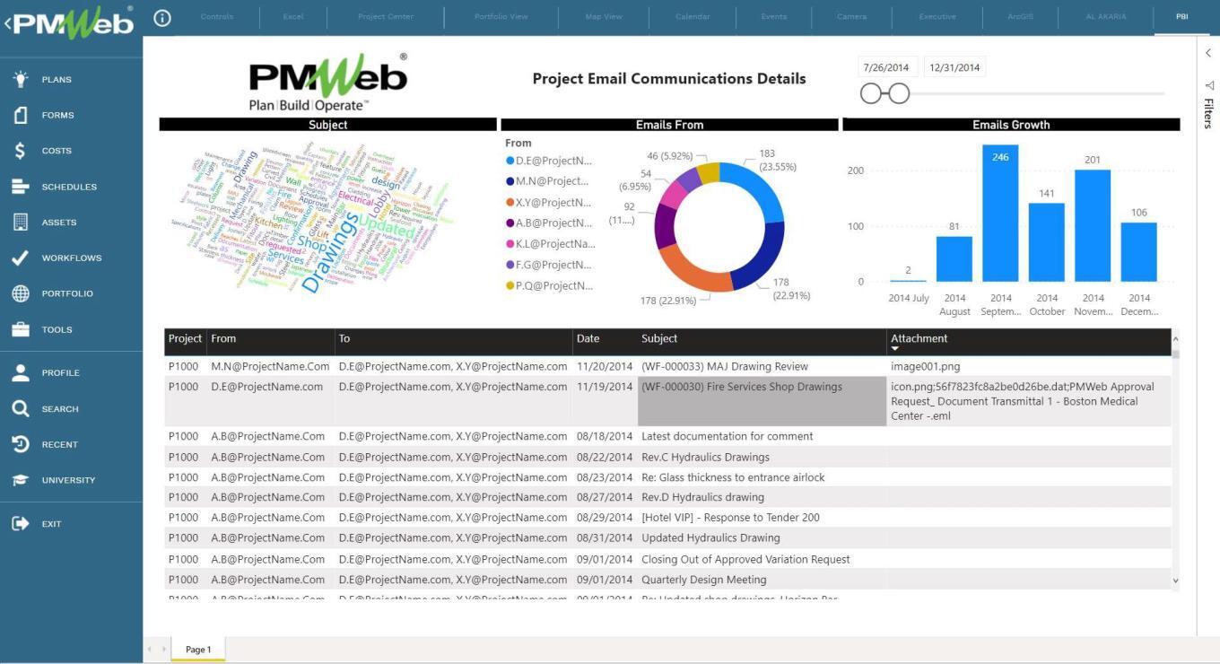 This enables receiving copies of all project email communications in the PMWeb Email Inbox module. Each project has its own inbox folder. For each received email communication, PMWeb captures the project, from, to, subject, and attachment details. In addition, the email itself can be viewed in PMWeb. Further, there is an option to group and select emails by applying filters, searching for emails, and modifying the register layout by hiding or displaying fields.