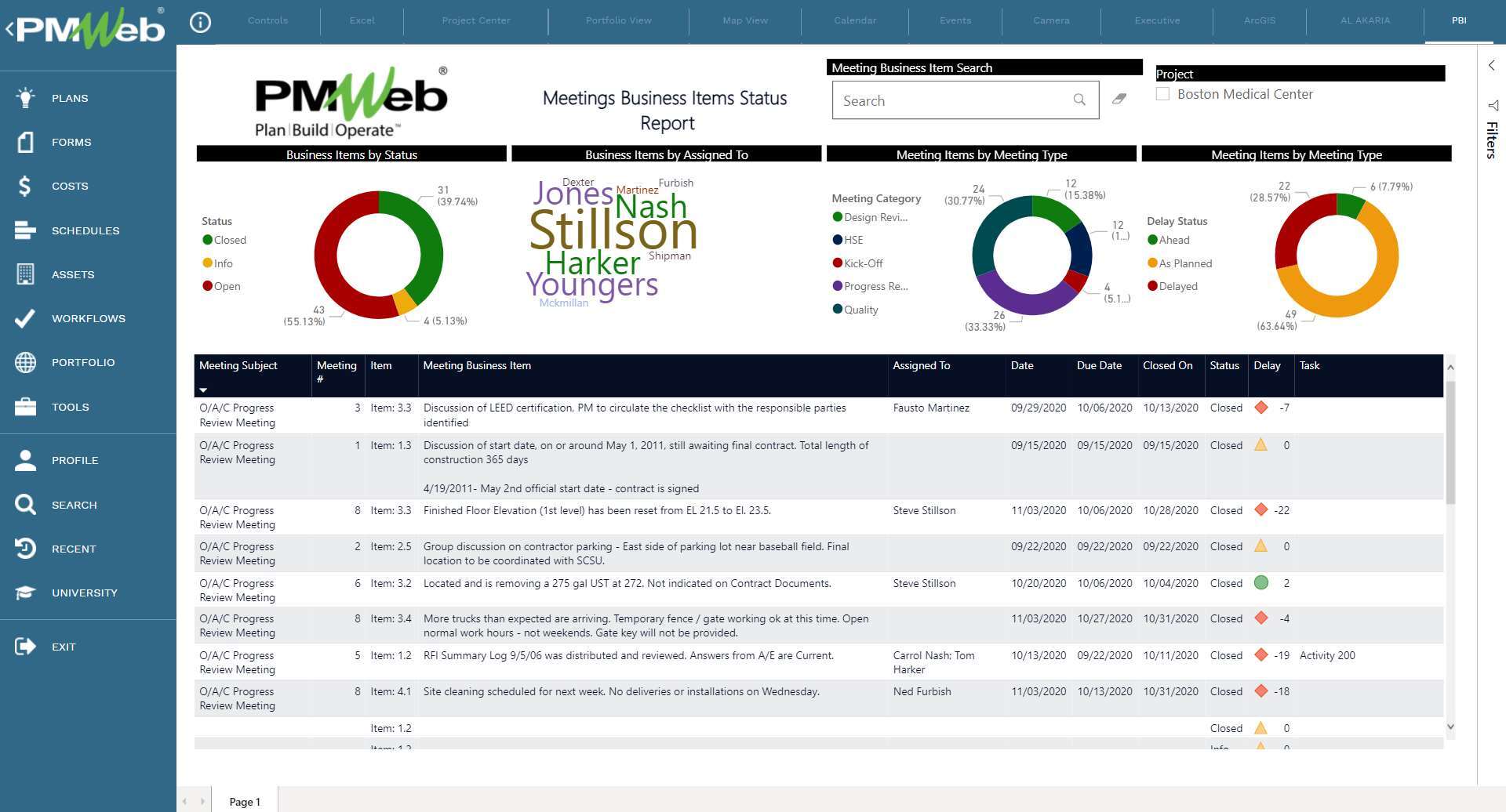 To be able to manage the business items that are part of each meeting minutes, PMWeb provides the parties involved in delivering construction projects with a single, web-enabled platform to manage meeting minutes. The PMWeb solution enables the project controls team members and other project team members to have a single real-time version of the truth of all meeting business items still pending or requiring actions to close.