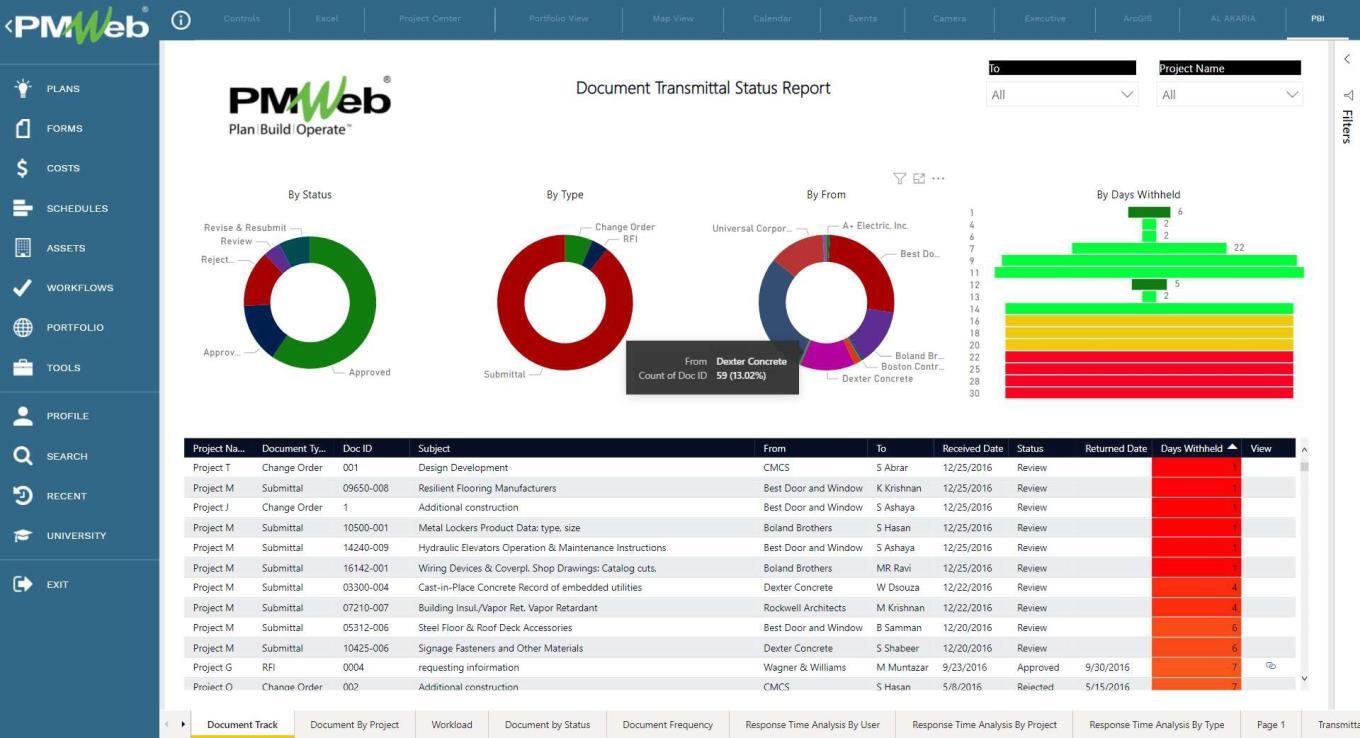The PMWeb transmittal module is one of the default modules for which the different project entities can transmit project communications. The ‘Form’ entity provides the details specific for each transmittal, such as WBS level, category, project stage, transmitted document or record, reference number, date, and due date, among others. PMWeb also allows adding an unlimited number of user-defined fields to better describe the transmittal if this is needed.