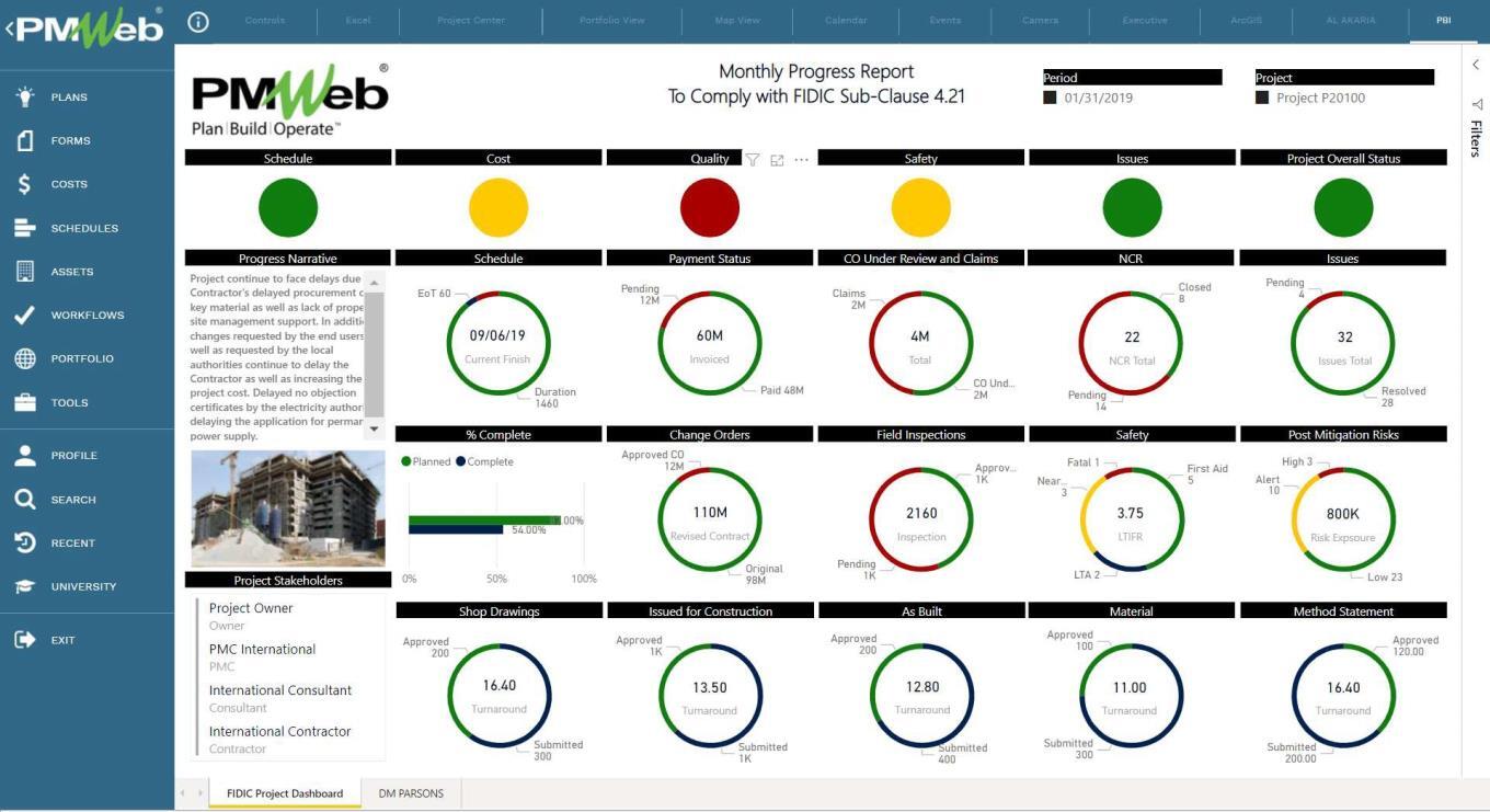 The PMWeb custom form builder helps create the narrative report template. It is highly recommended that the narrative report template is structured in a format that is aligned with the progress report or dashboard. It has data fields that are predefined with the list of values that are used in reporting the project’s performance and the colors used for the key performance indicators. The template gets assigned a workflow to capture the details of the submission, review, and approval tasks are done for each month.