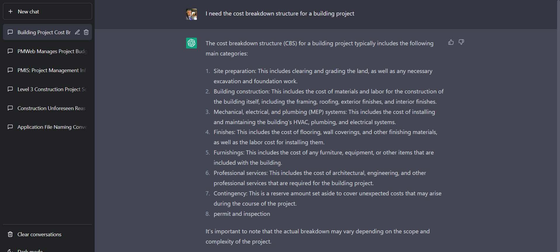 For example, when I submitted the request for “I need the cost breakdown structure for a building project”, ChatGPT gave eight areas that the cost breakdown structure (CBS) should cover. Although this is not a breakdown structure that I was anticipating getting, nevertheless, it is a good start for someone that wants to have input on what should be included in the cost breakdown structure.