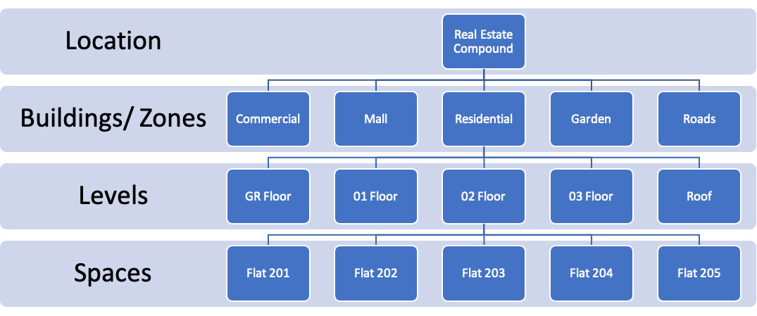 For example, assume that one of the property owner’s real estate developments is a residential compound in one of the neighborhoods in the country. The compound, a location, includes several residential and commercial buildings, a shopping mall, and public gardens with associated infrastructure. Facilities including levels for which the residential towers will consist of apartments and the commercial towers will include offices.