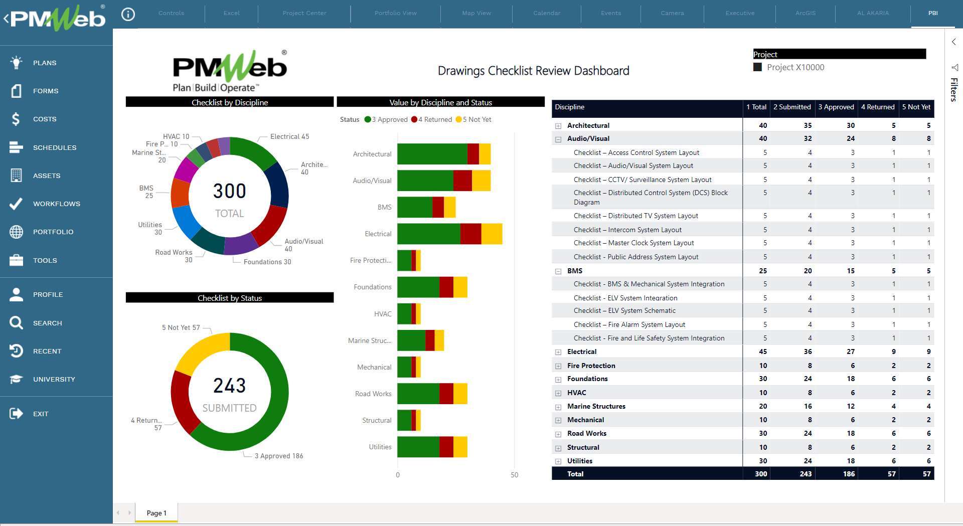The drawing review dashboard provides real-time reporting on planned, current, and completed reviews. The dashboard provides a donut visual to summarize the total number of drawing review checklists by discipline and another donut visual to summarize the total number of submitted drawing review checklists by status. The dashboard includes a bar chart that displays the status drawing review checklists by discipline. In addition, the dashboard includes a table detailing all design review checklists and their status. The table summarizes the design review checklists by discipline.