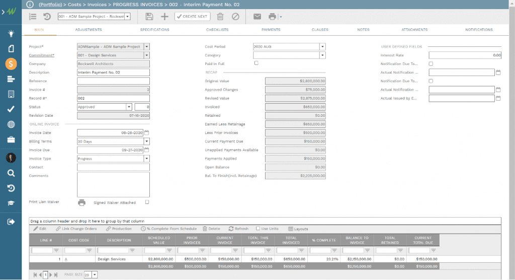 The actual cost that can be posted against a project is either related to interim payment certificates (IPC) or invoices issued against each awarded contract or other expenses that are not related to a contract. The IPC is captured using the PMWeb progress invoice module while non-commitment expenses are captured using PMWeb miscellaneous invoices and timesheet modules. The valuation of interim payment certificates can be based on the approved percent complete values for activities that are associated with each bill item. PMWeb scheduling module is used to import and store the Oracle Primavera or MS Project schedules for each progress period.