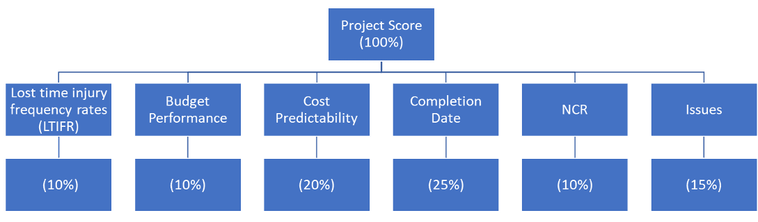As detailed earlier, each key performance indicator (KPI) has a weight for which the sum of all KPIs’ weight will be 100%. This will help calculate the weighted Project Performance Index (PPI) for each project at the end of each period in an objective format. It should be noted that for some projects, the weight distribution for the six key performance indicators could vary depending on the importance of those project’s objectives to each project.