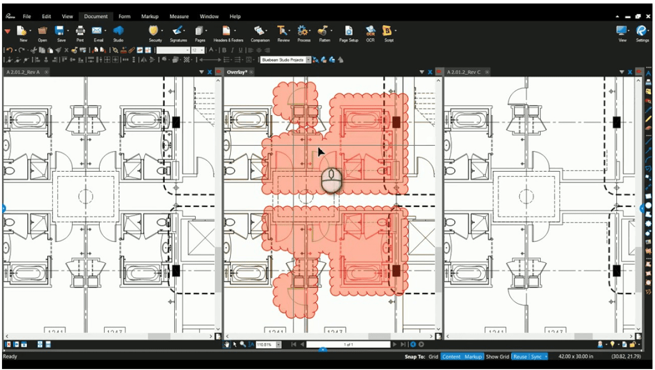 Using advanced drawing markup and comparison applications like Bluebeam Revu, the project team can use Bluebeam Revu to detect and view changes between the two drawing revisions (in PDF file format). By using the PMWeb and Bluebeam Revu integration, all remarks and a list of changes made to the drawings can be imported into the PMWeb Bluebeam Markups module. This enables maintaining a single repository of all drawings changes as well as monitoring, tracking, and reporting on those changes.