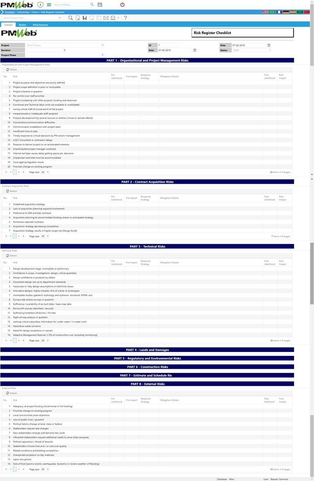 Using Project Management Information Systems (PMIS) like PMWeb, organizations can use risk checklists to formalize the qualitative risk analysis process and produce the risk register needed for managing all types of projects and in particular capital projects. PMWeb custom form builder will be used to create a comprehensive risk checklist that will cover all risk categories. The custom form header will include details on the project, project phase where the risk checklist analysis was done for, status of the risk checklist which will be in accordance with the assigned workflow and any other general information needed for the checklist.